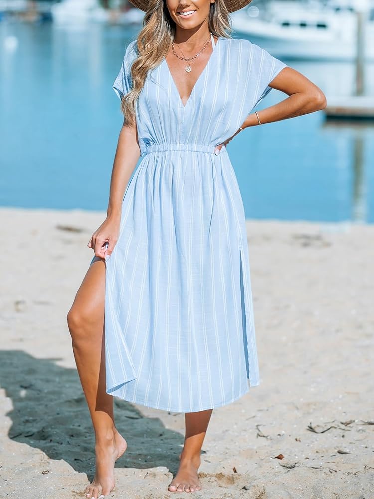 [𝐕 𝐍𝐞𝐜𝐤 𝐒𝐡𝐞𝐞𝐫 𝐂𝐨𝐯𝐞𝐫]: Fashion Outfits For Women/High Side Slit/Beach Cover Up For Women/Sheer Coverups/Short Sleeves/Tassel Hem/Beach Wear/Loose Fit/Swimwear/Bathing Suit Cover Ups Dresses/Bikini One Piece Coverup/Vacation Outfits For Women/Summer Clothing For Women 2024/Holiday Outfits For Women