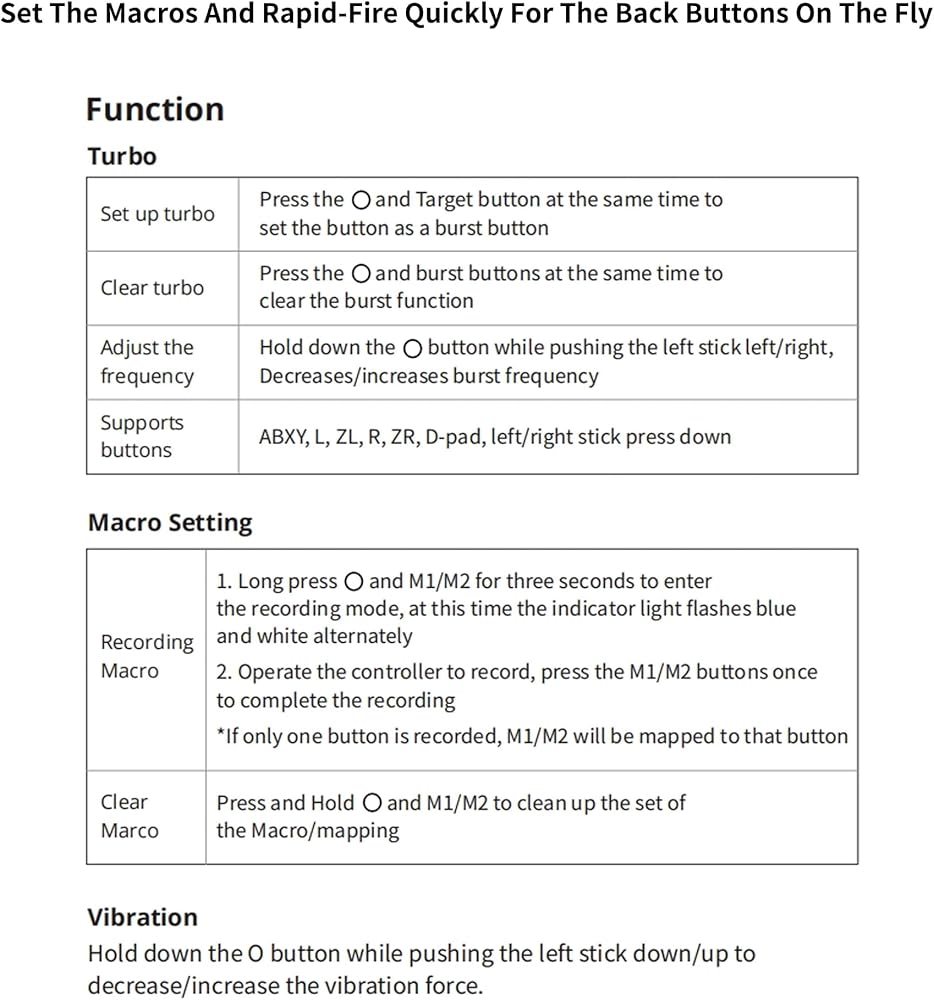 【Set The Macros And Rapid-Fire Quickly For The Back Buttons On The Fly】You can customize your controller settings (such as turbo, macros, vibration functions) just when you trun on the controller(shows in the 4th pic), Of course also can do these setting on flydigi space station software.