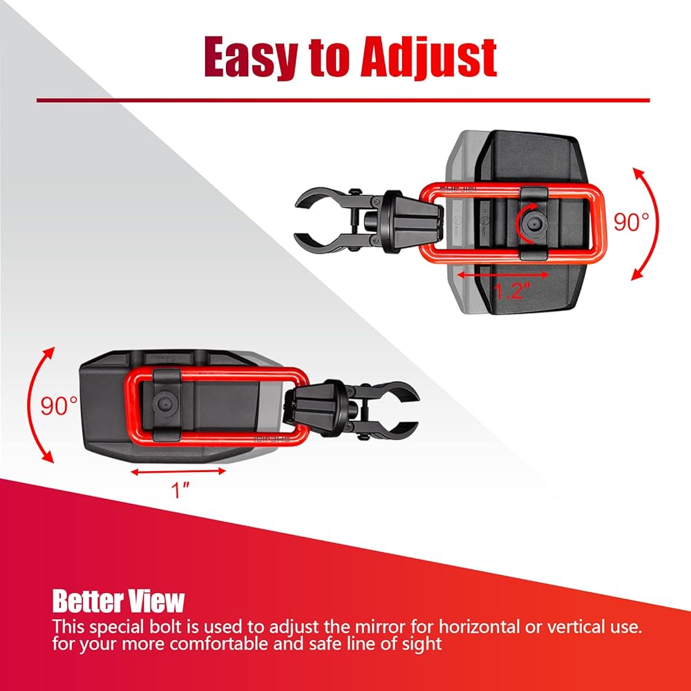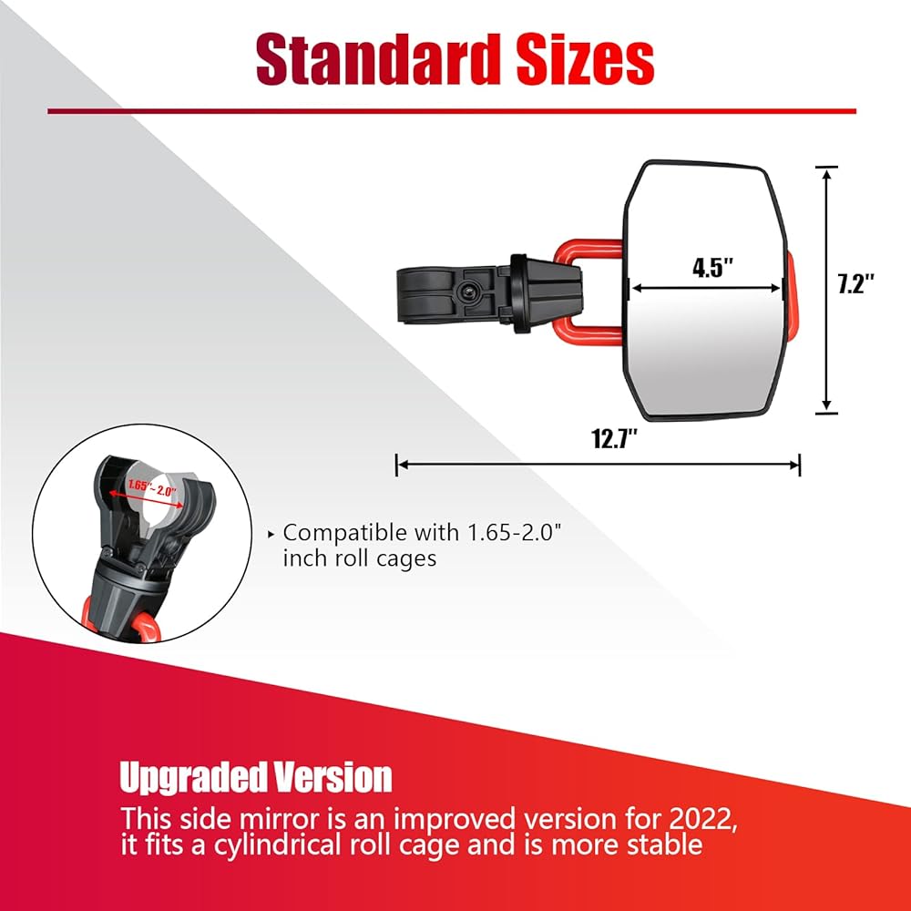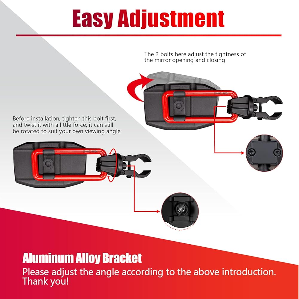 【Compatibility】This rearview mirror is a 2023 improved version and is suitable for cylindrical roll cages with a diameter of 1.65" to 2". This UTV side mirror is compatible with the full line of Polaris RZR, Can-Am Maverick, Yamaha YXZ Rhino Wolverine, Kawasaki Mule Teryx, Honda Pioneer SXS, Gator XUV HPX.
