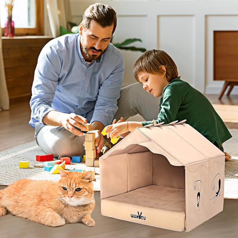 Cat Beds for Indoor Cats -Dog House for Small Dogs Or Cats,Removable Cushion with Collapsible and Foldable Puppy Pet Beds,3 Folding Methods for Indoor Outdoors (Khaki)