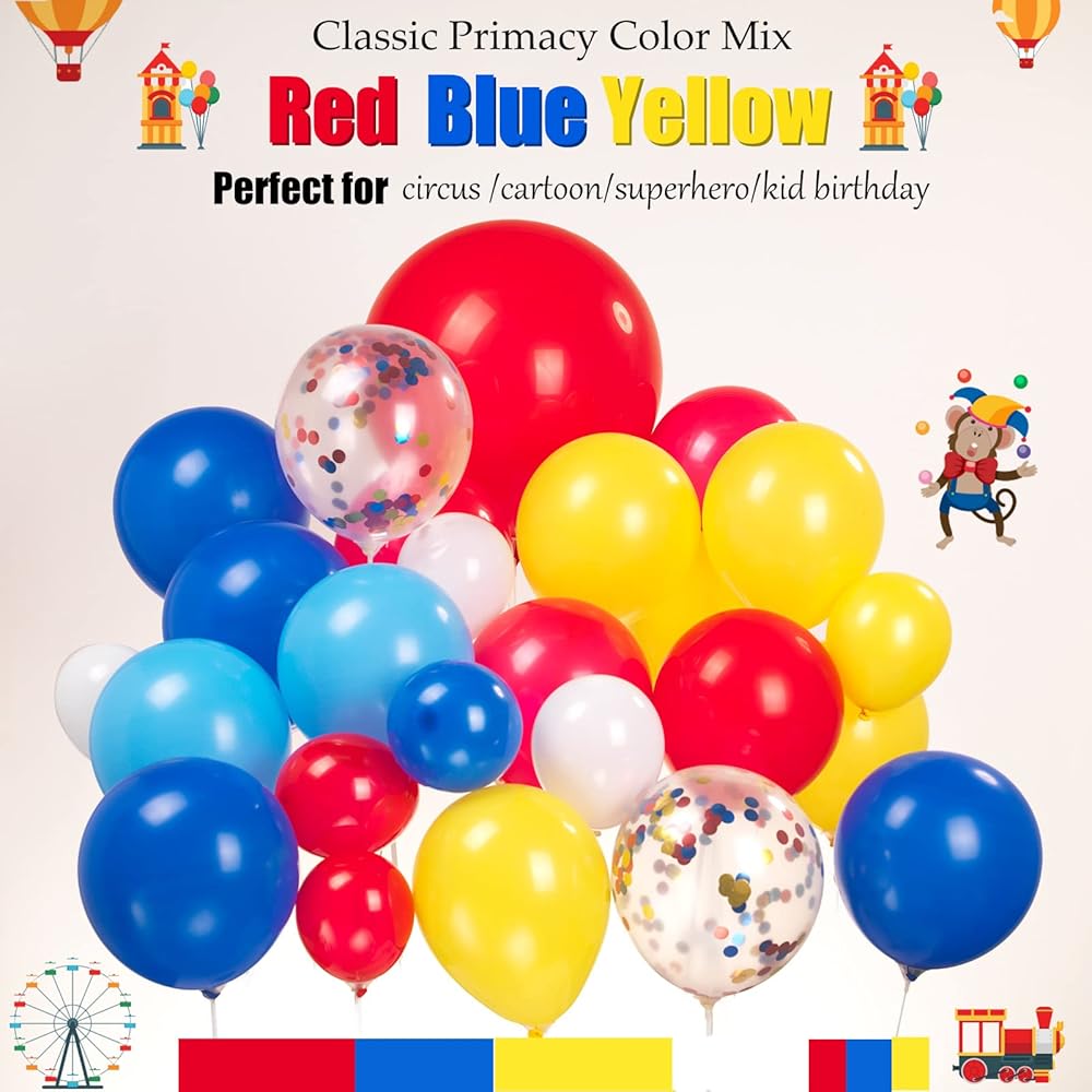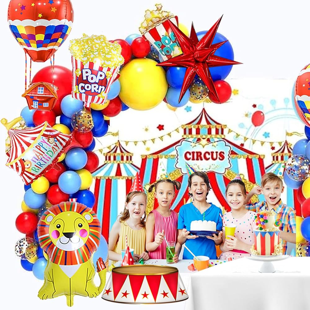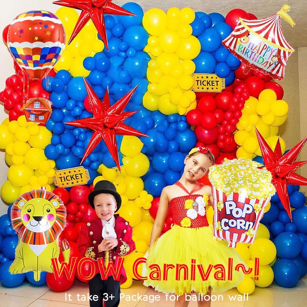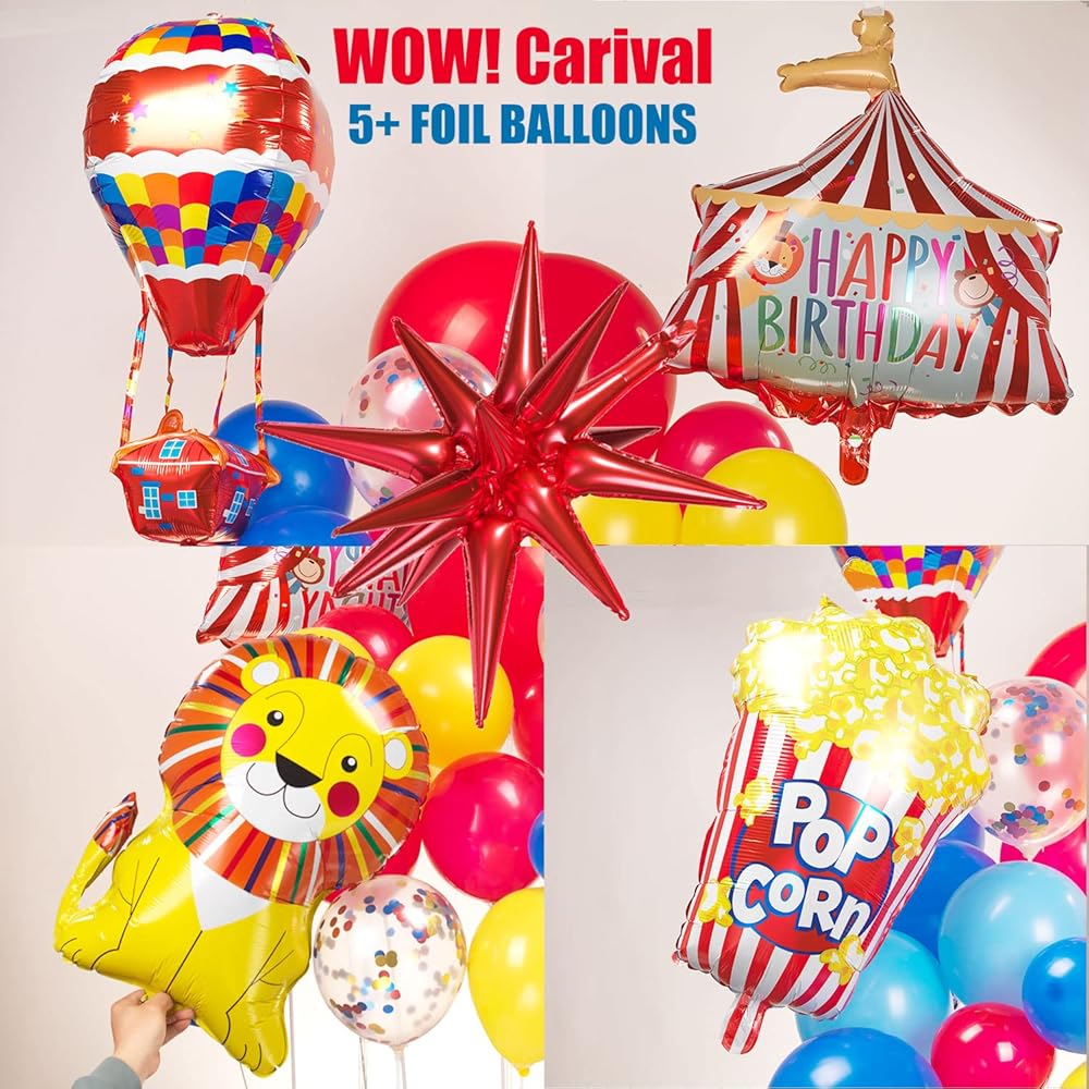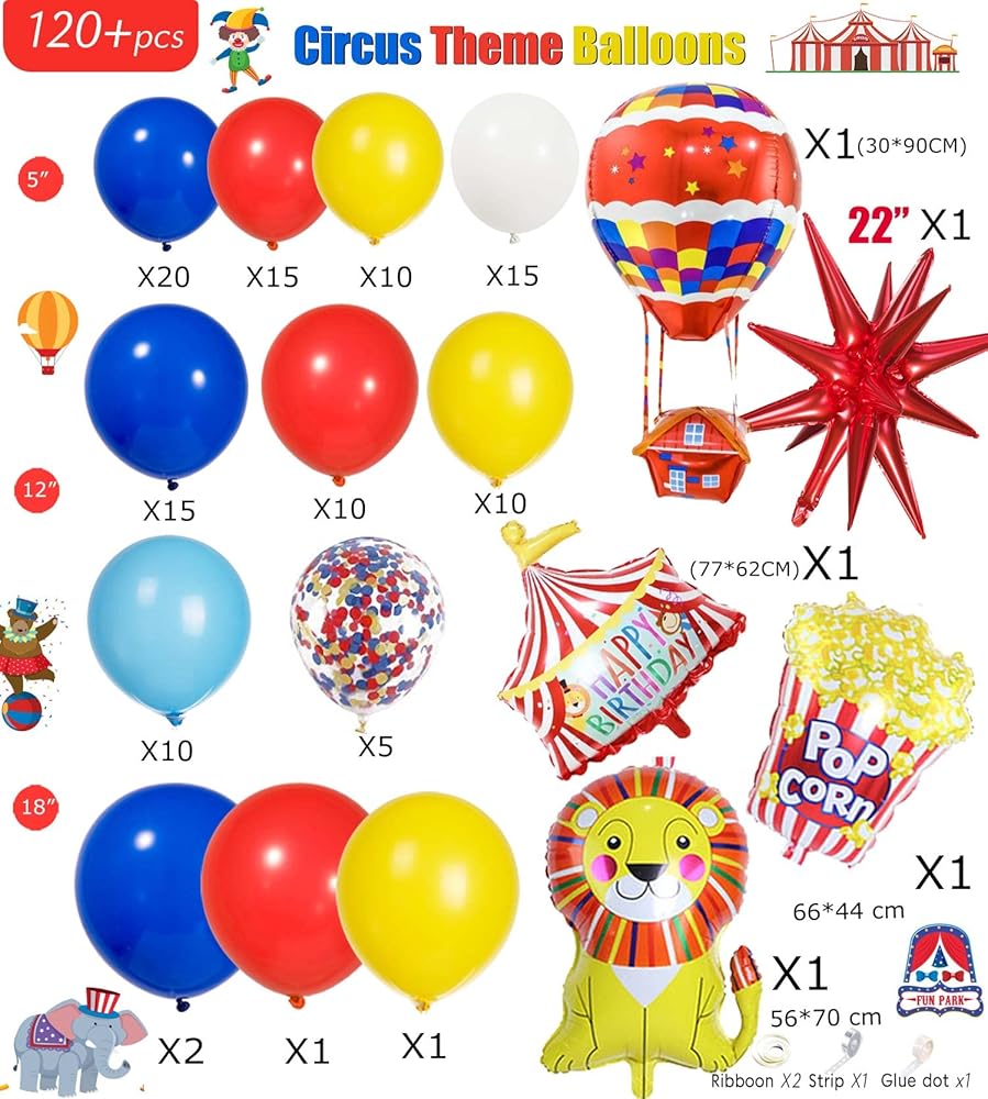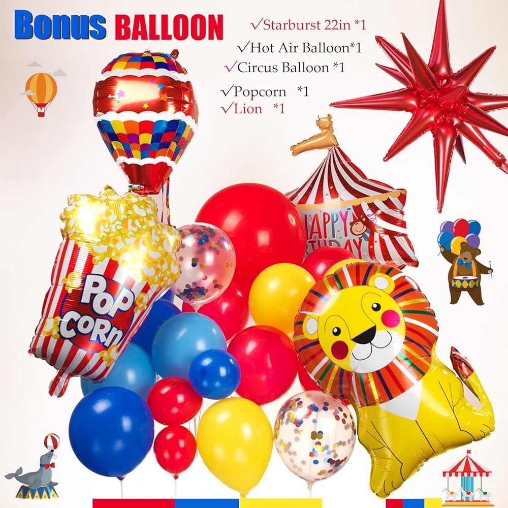 【Circus Red Blue Yellow balloon Kits】120PCS All in 1 Package including Red/Blue/Light blue/yellow/White in 3sizes:5/12/18inch,with 4tools enough for10-12FT Garland, in addition large 22 inch starburst balloons and Circus theme Foil balloons comes with Popcorn/lion/Hot air balloon/and Circus Birthday Decor balloon for Modeling,all make your The Themed party is more memorable. Meet all the little surprises of the Circus Cartoons theme birthday Party.