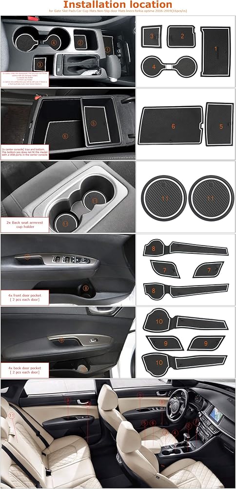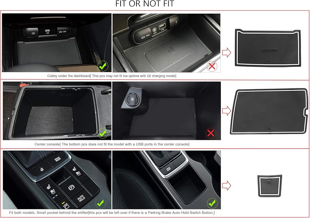 PLEASE NOTE: ① The pcs goes to the cubby under the dashboard may not fit kia optima with QI charging model; ② The center console bottom pcs does not fit the model with a USB ports in the center console.[Please pay attention to the listing pictures, be sure to match with your vehicle model before purchasing.]