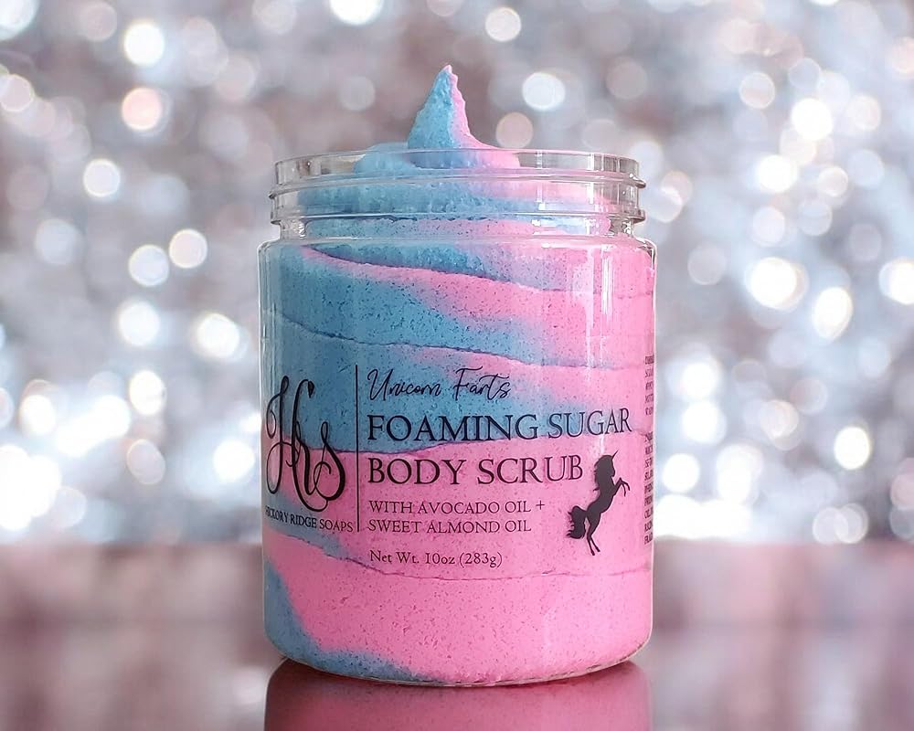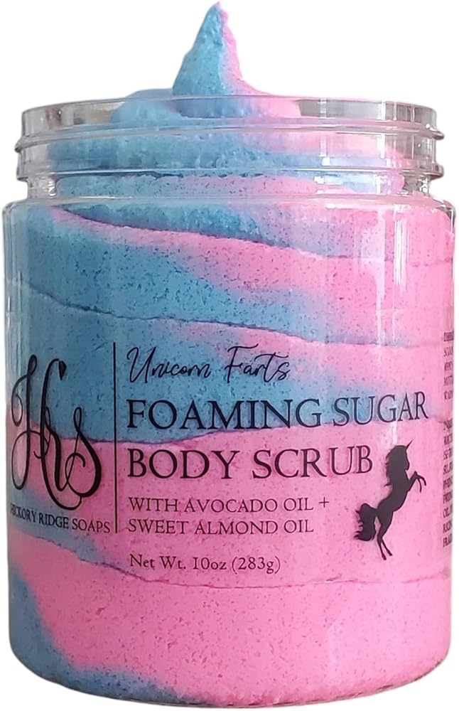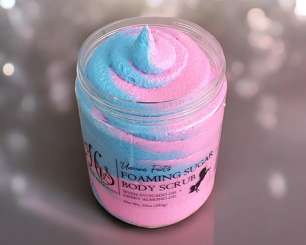 Our Unicorn Farts Whipped Body Scrub is a magical blend of juicy strawberry, French vanilla, and fresh spun cotton candy! Not only does it smell like a dream, but it's perfect for gentle exfoliation and cleansing that works for all skin types. Plus, a little goes a long way, so you can keep scrubbing to your heart's content! Time to turn your shower into a scented wonderland.