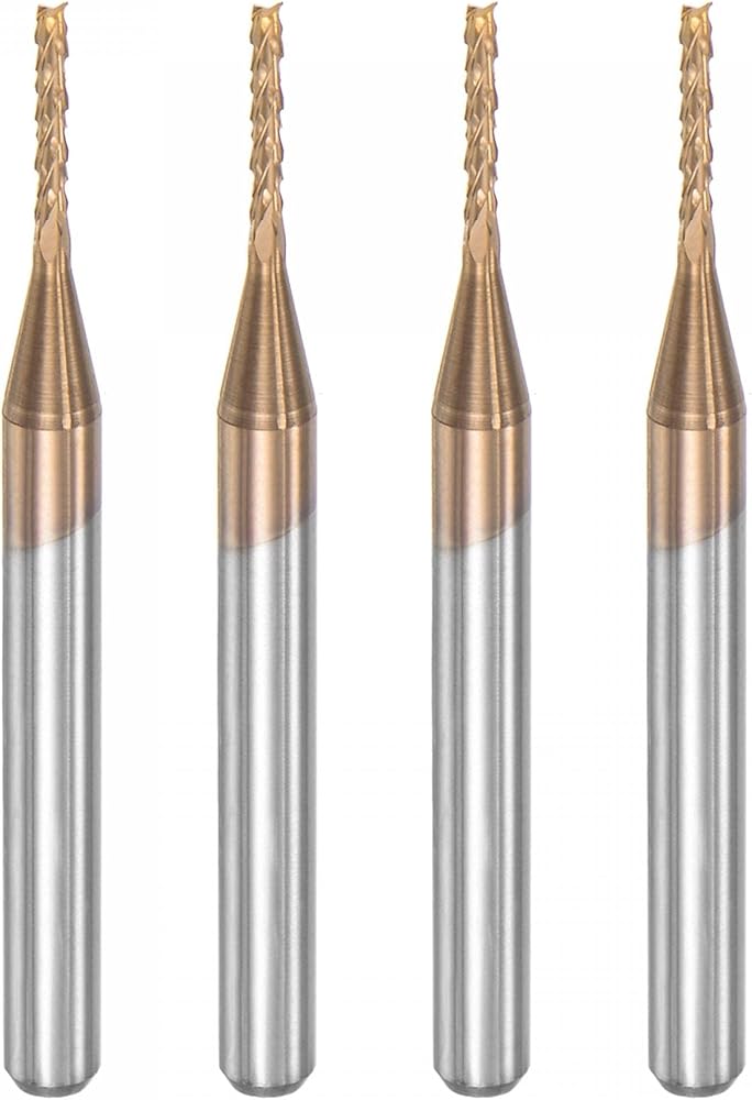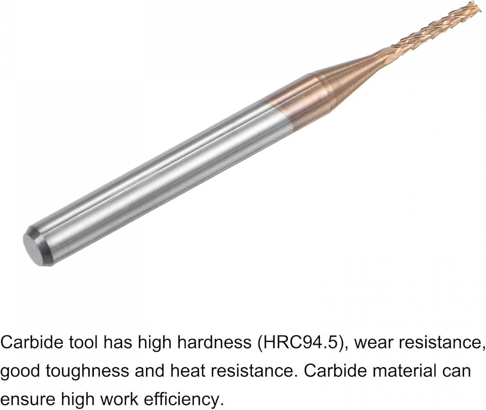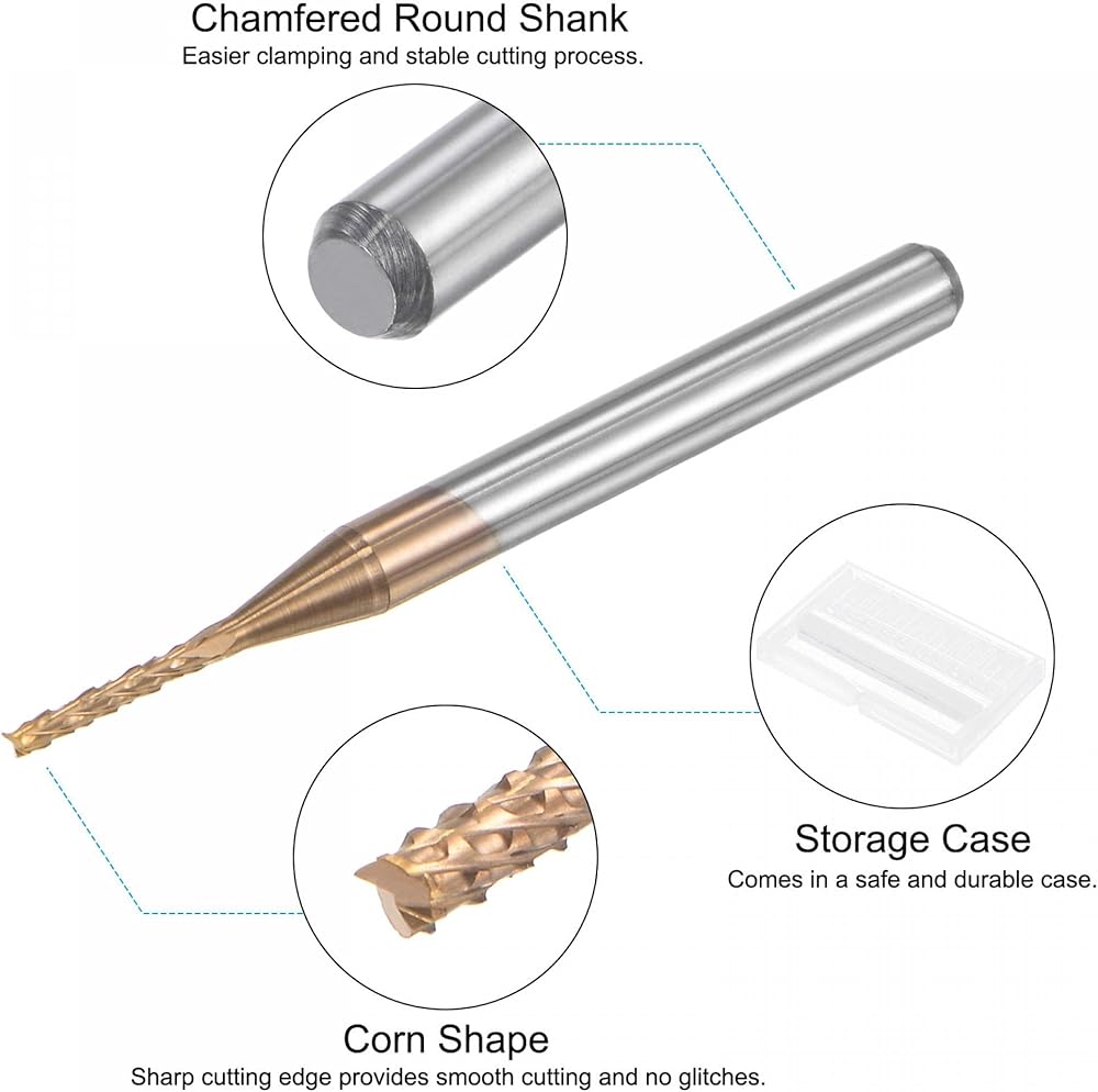 End Mills: Cutting edge diameter: 0.2mm / 0.008"; shank diameter: 3.175mm / 1/8"; cutting edge length: 1mm / 0.04"; overall length: 37mm / 1.46"; milling direction: right hand; style: corn shape. Carbide can run at higher speed than high-speed steel.