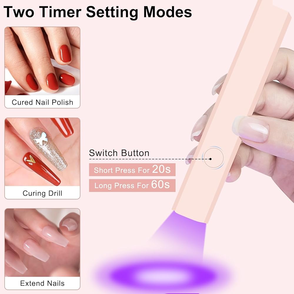 【Pen Shape Design Mini Nail Light】The Handheld UV Light for Nails adopts a one-shaped lamp body design, which is more friendly to long nails. It can cure evenly on long and short nails and quickly cure nail polish glue.The appearance of mini nail light is made of soft glue spray paint, and the velvet feel makes your manicure process more comfortable, easier and more convenient, and you can enjoy a better manicure experience.