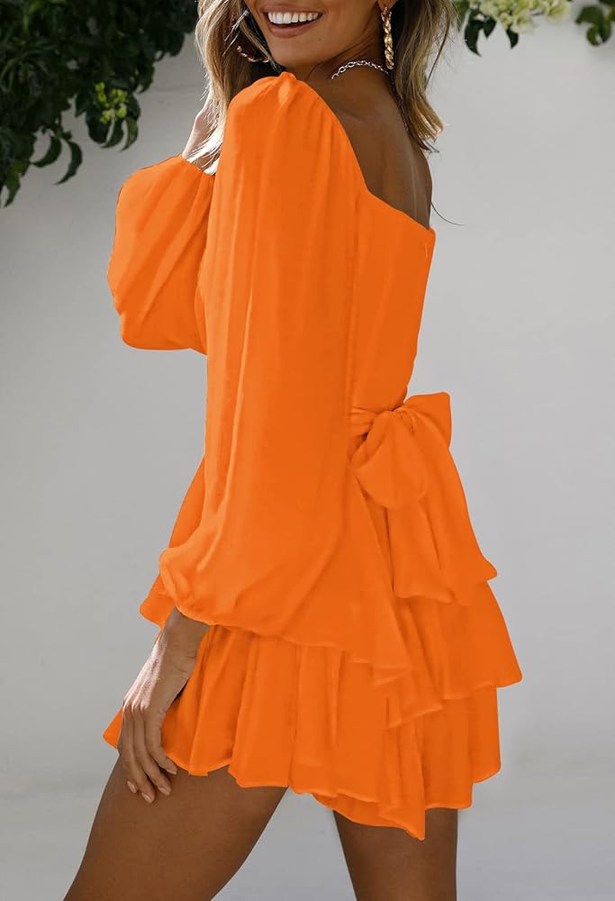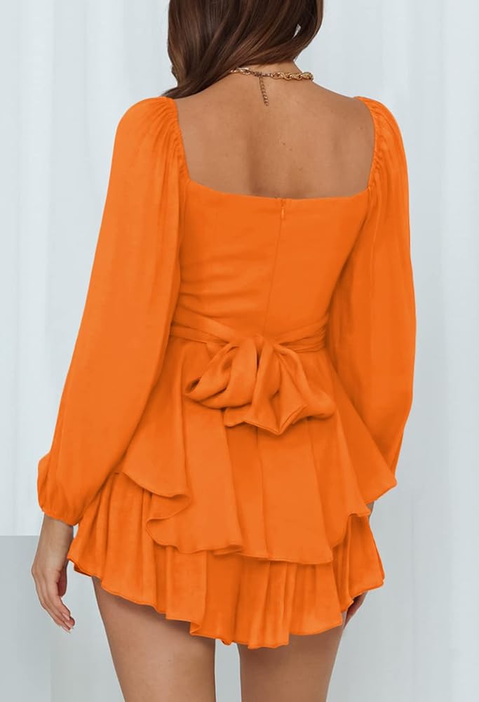 Women's romper shorts with lantern long sleeves, low square neck, off shoulder, tie waist, solid color, elastic neckline and cuffs, double layer ruffle hem, back zipper closure, above knee length, A-line, swing and elegant vintage style