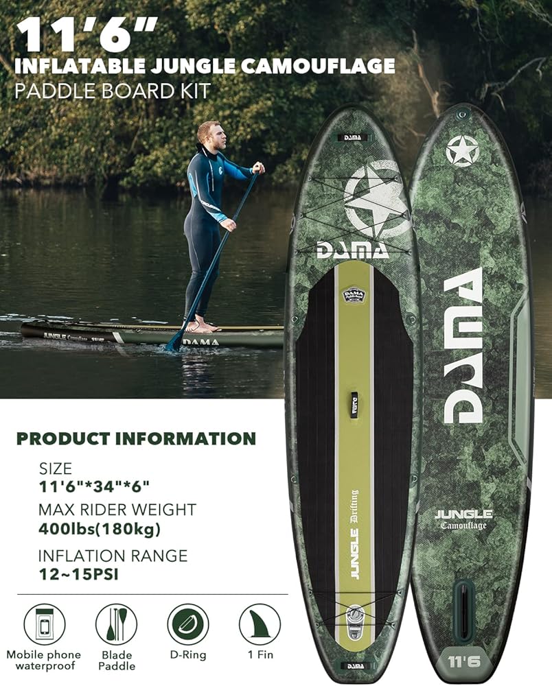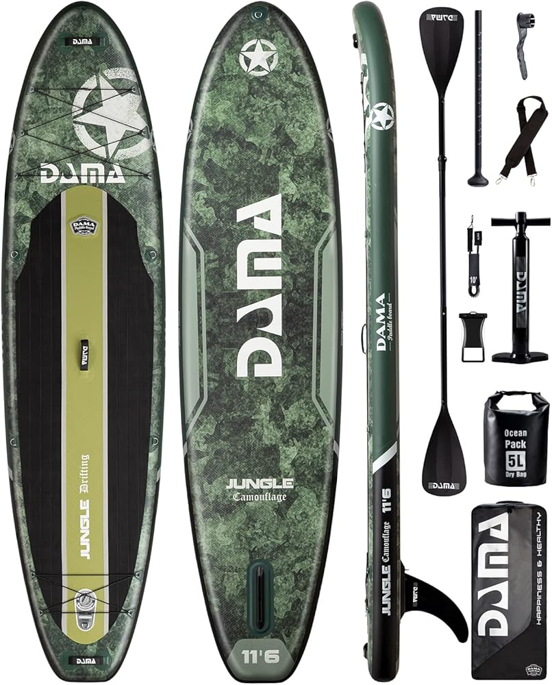 لوح داما العسكري الأخضر قابل للنفخ بالهواء، لوح مجداف مقاس 11'6 بوصة * 34 بوصة خفيف الوزن ومتين، ملحقات لوح مجداف SUP ممتاز، تصميم ثابت واسع، سطح مريح مانع للانزلاق