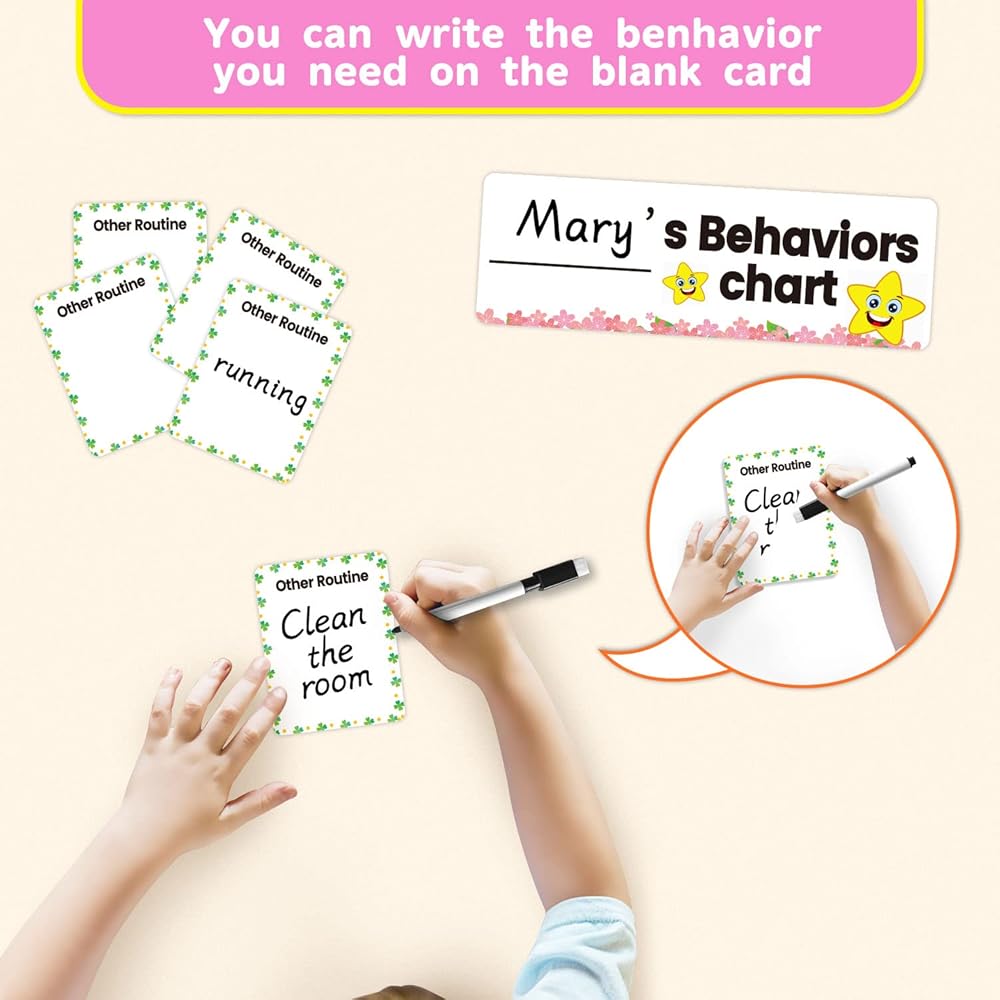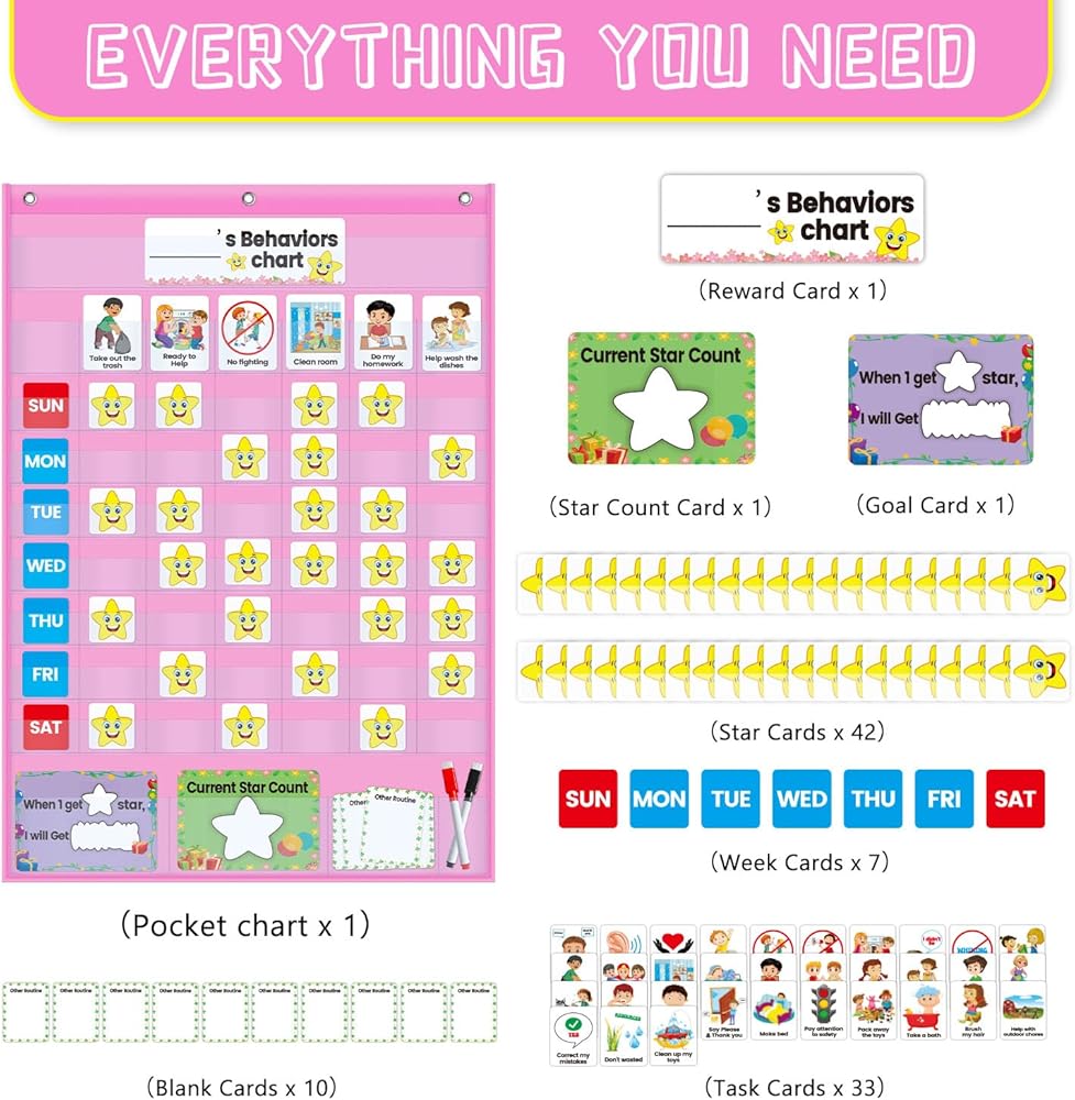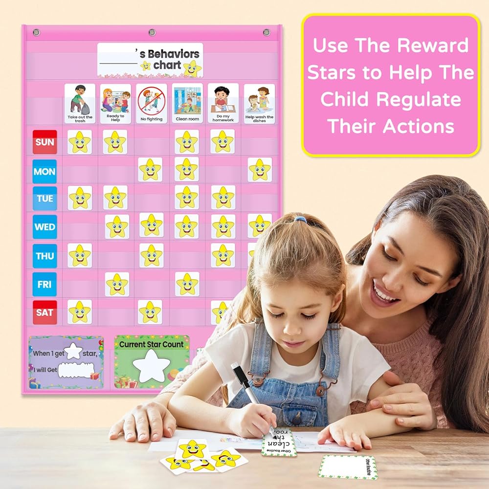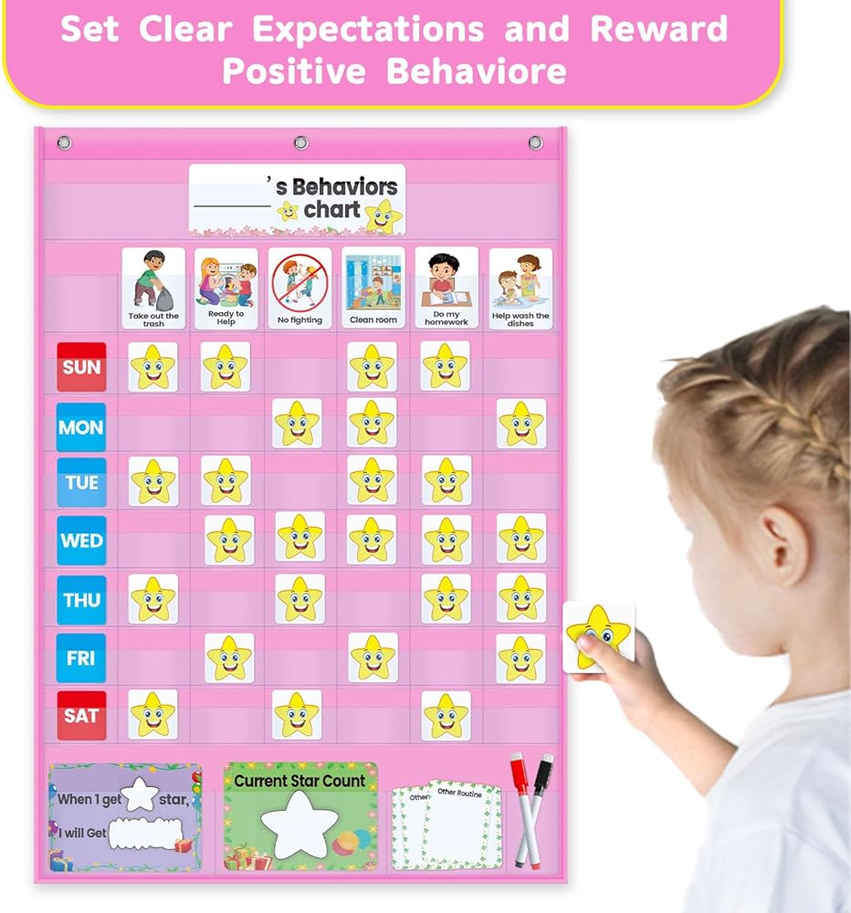 Behavior Pocket Chart - Reward Star Chore Chart for Toddlers at Home and School - Daily Responsibility Chart, Hanging Option -Designed by Real Mom &Teacher for Positive Parenting (Pink)