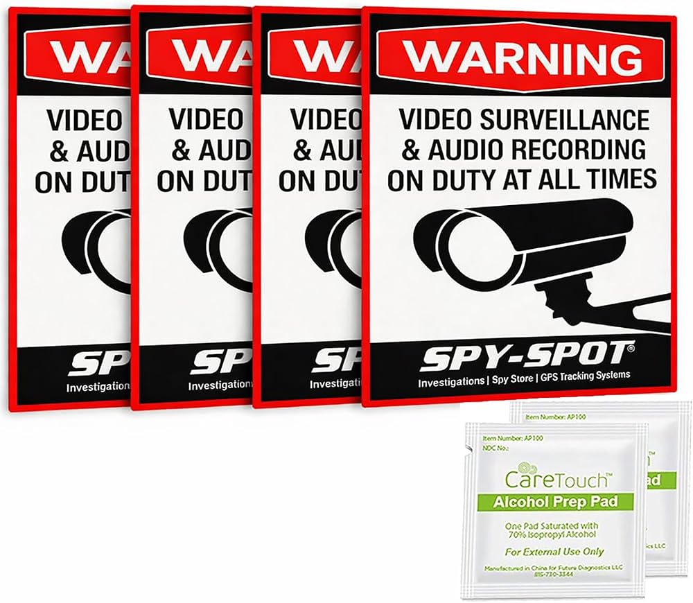 Spy Spot Audio and Video Surveillance Warning Decals - 4 Pack 4" x 3" Weatherproof UV Resistant Vinyl Security Stickers for Windows, Doors, Walls, Home, Business, and Vehicles - Easy Peel and Apply