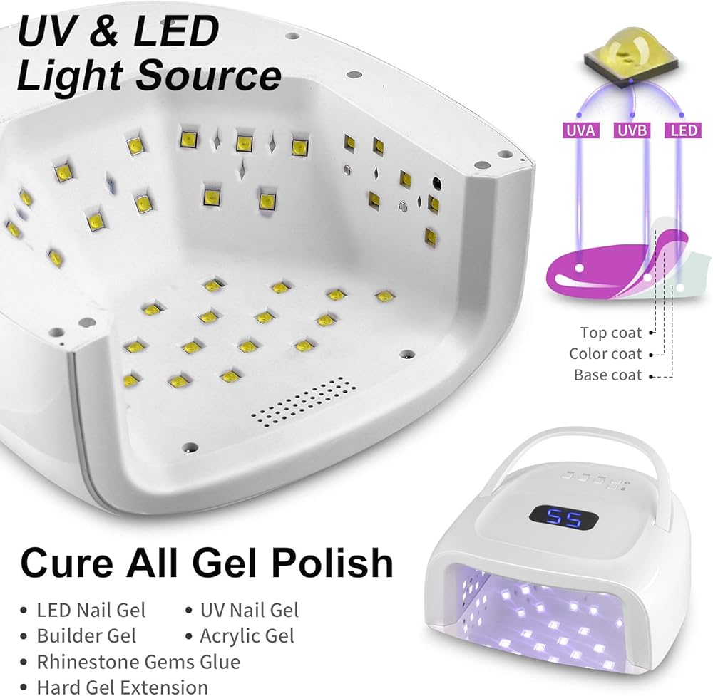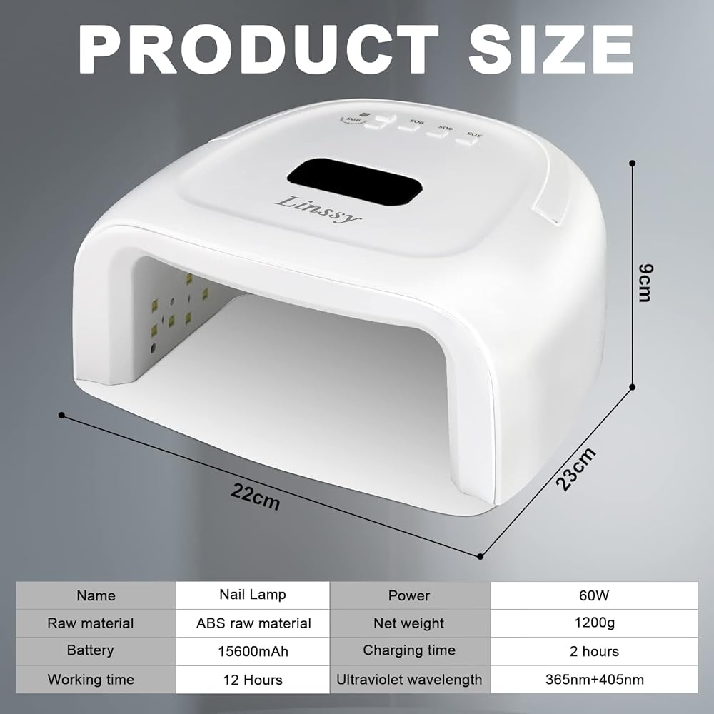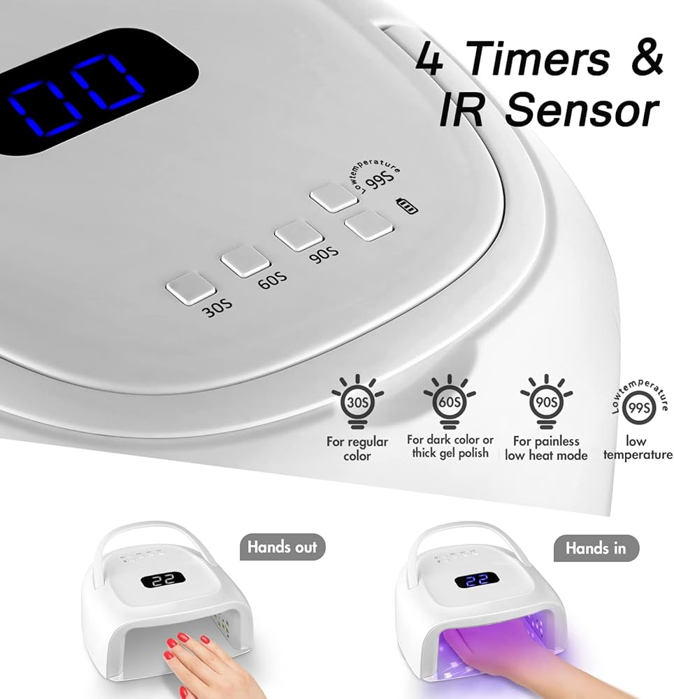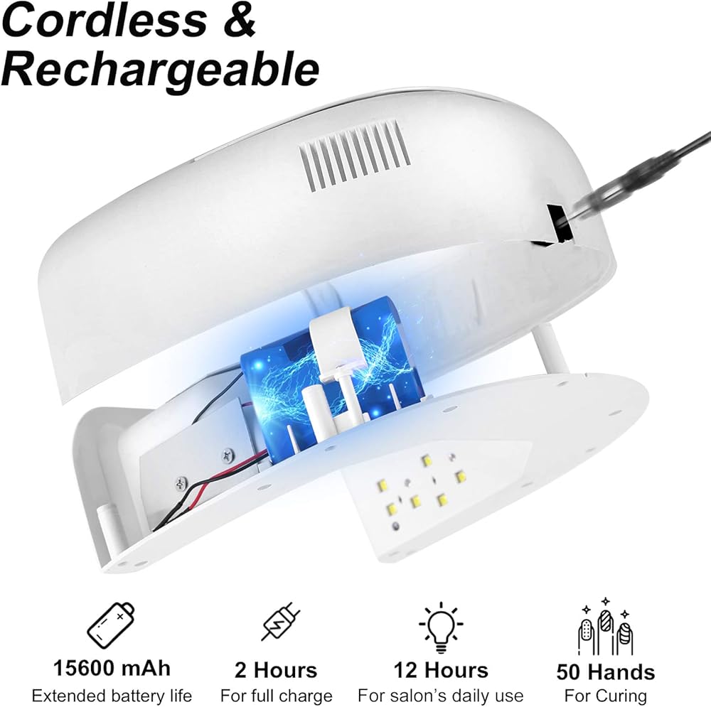 CORDLESS & PORTABLE -This wireless nail lamp built-in rechargeable battery 15600mAH battery, 12 hours continues working time after 2 hours full charging. Lift Handle design make the nail lamp easy to carry. It's the perfect pocket nail lamp for school, office, home use, and travel.