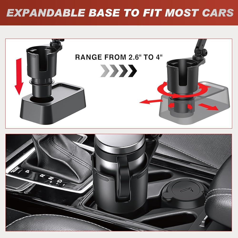 EXTENDABLE BASE FOR VERSATILITY: The car seat cup holder can be expanded from 2.6" to 3.9" in diameter, fitting a wide range of automotive cup holders. Simply twist the base to adjust and securely fix it in place. It is suitable for use in cars, SUVs,trucks and RVs.