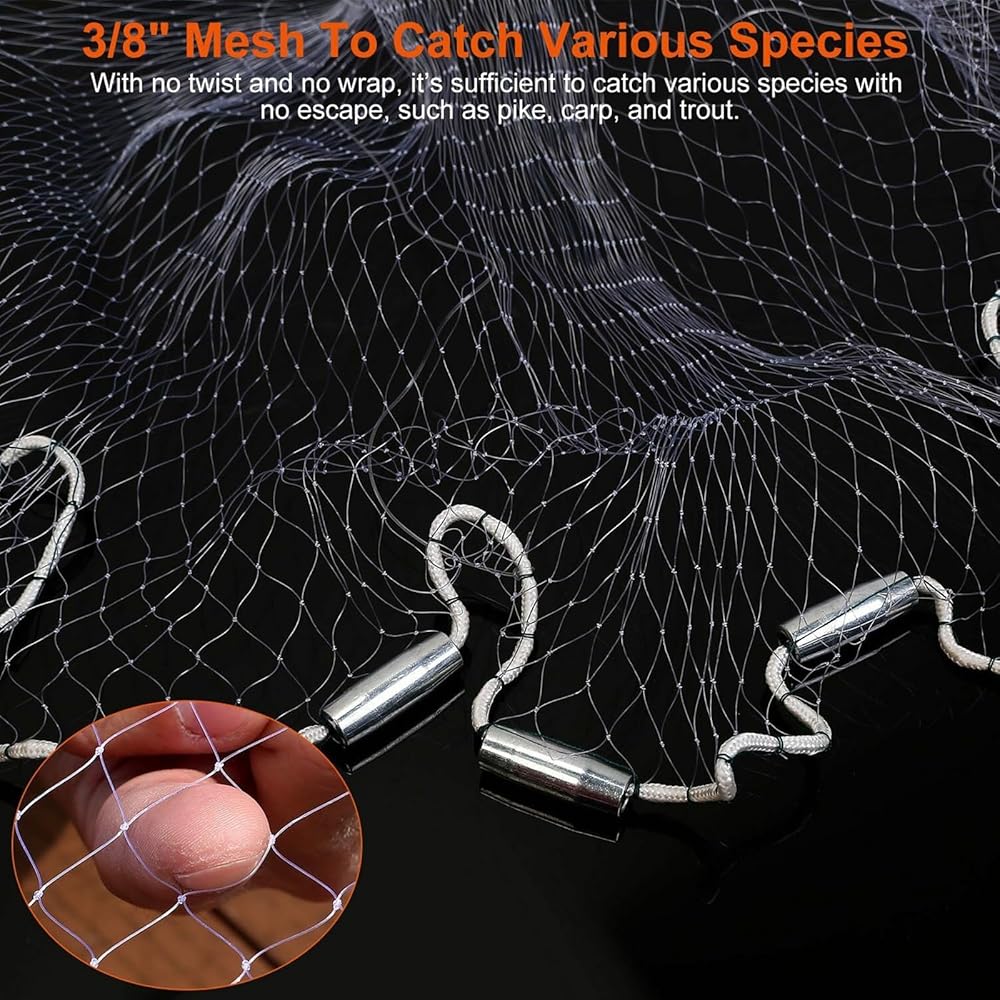 [3/8 Inch mesh size] 3/8'' mesh accommodates most bait species and provides savings in bait cost. The bottom of the net adopts each mesh bundle line, so that the net is evenly stressed, enhancing the durability of the net.can be used to catch fish in deeper waters.