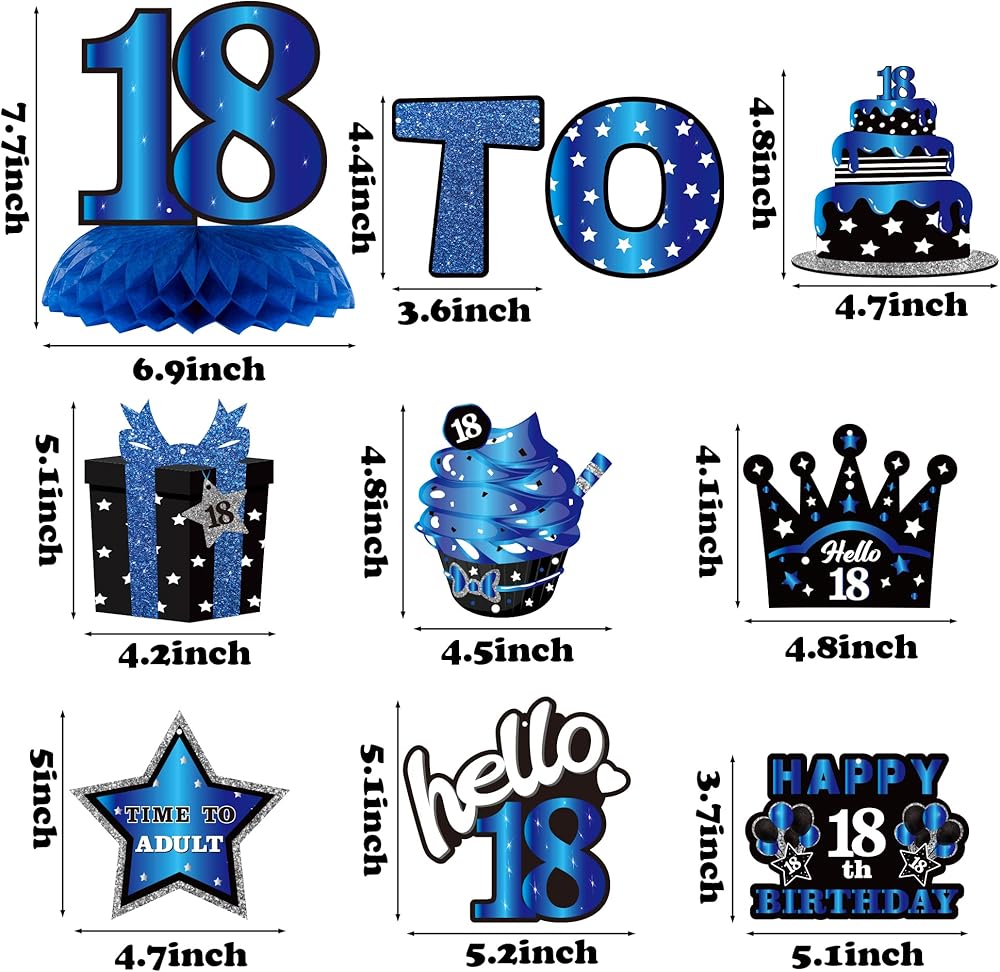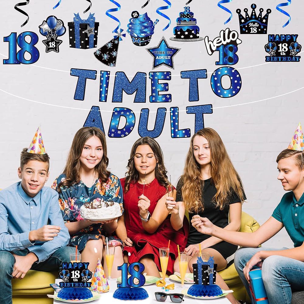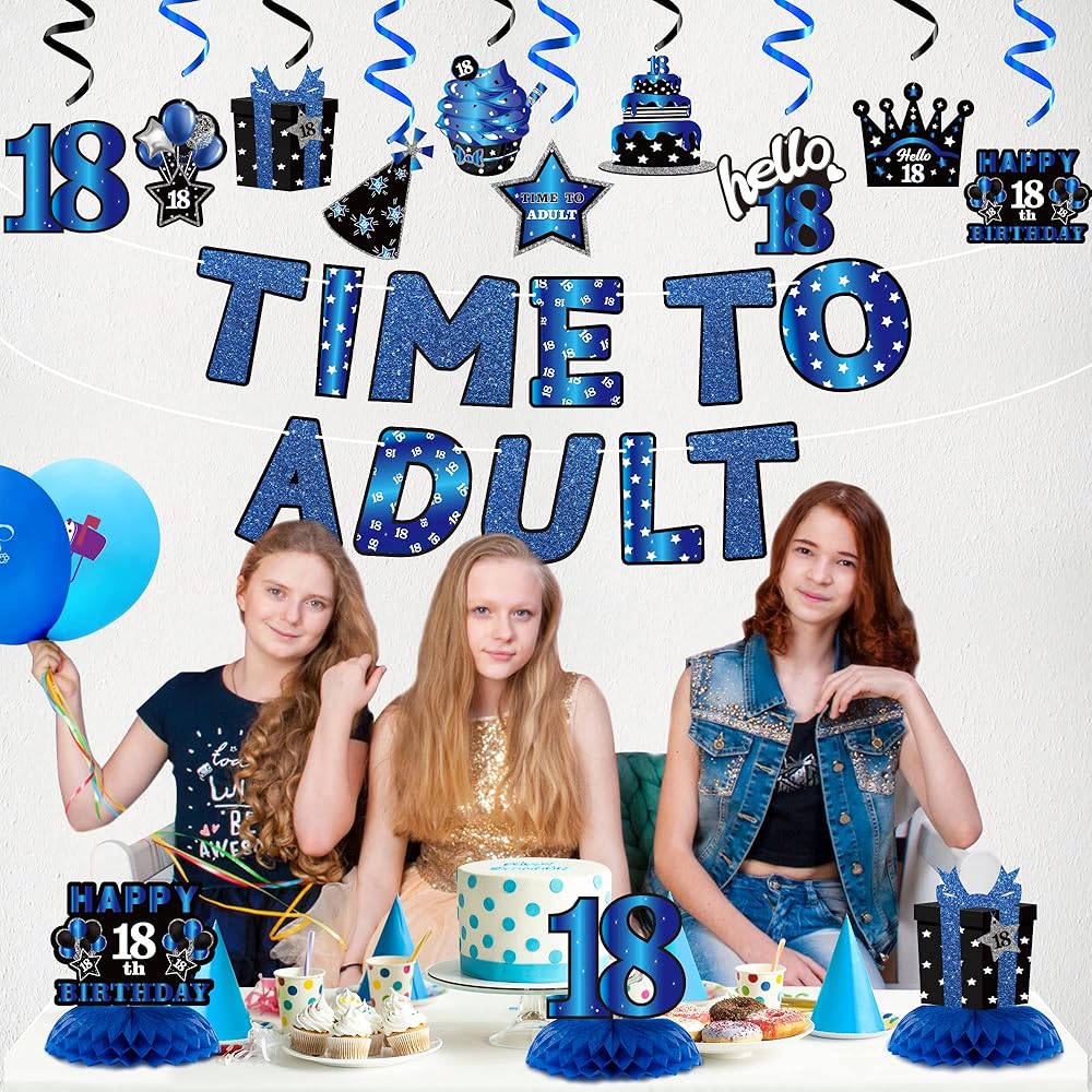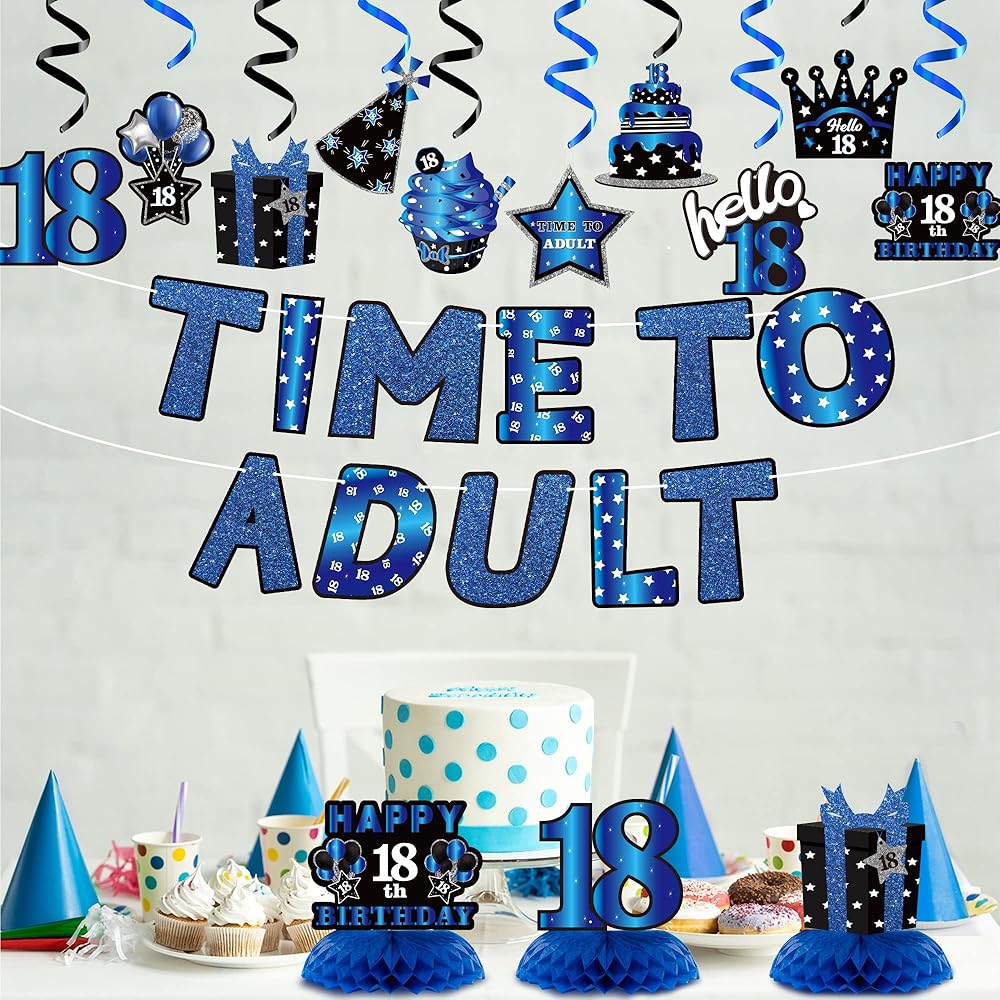 Shining Package: The glitter blue black themed package includes 3 honeycomb centerpieces, 1 Time To Adult banner(Not pre-string banner,need to be install bu yourself), 10 birthday pattern cards and 10 hanging swirls. Multiple ways to match and decor.