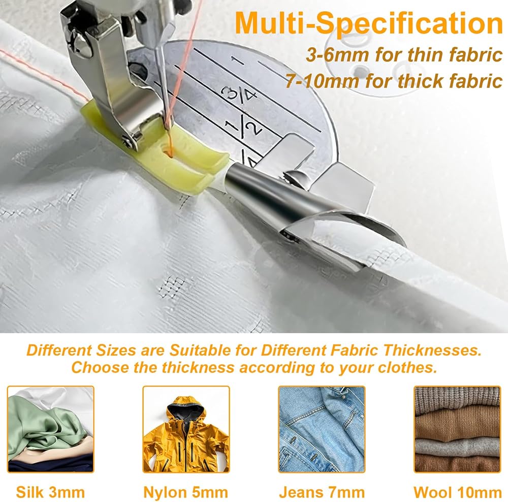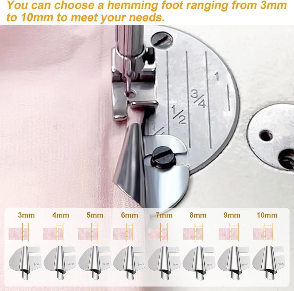 【Multiple Sizes】You can choose a hemming foot ranging from 3mm to 10mm to suit your needs. You can choose different sizes to sew based on your needs.