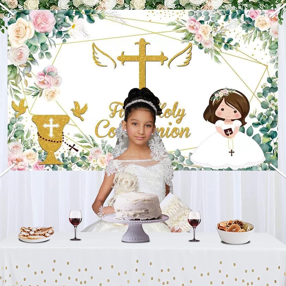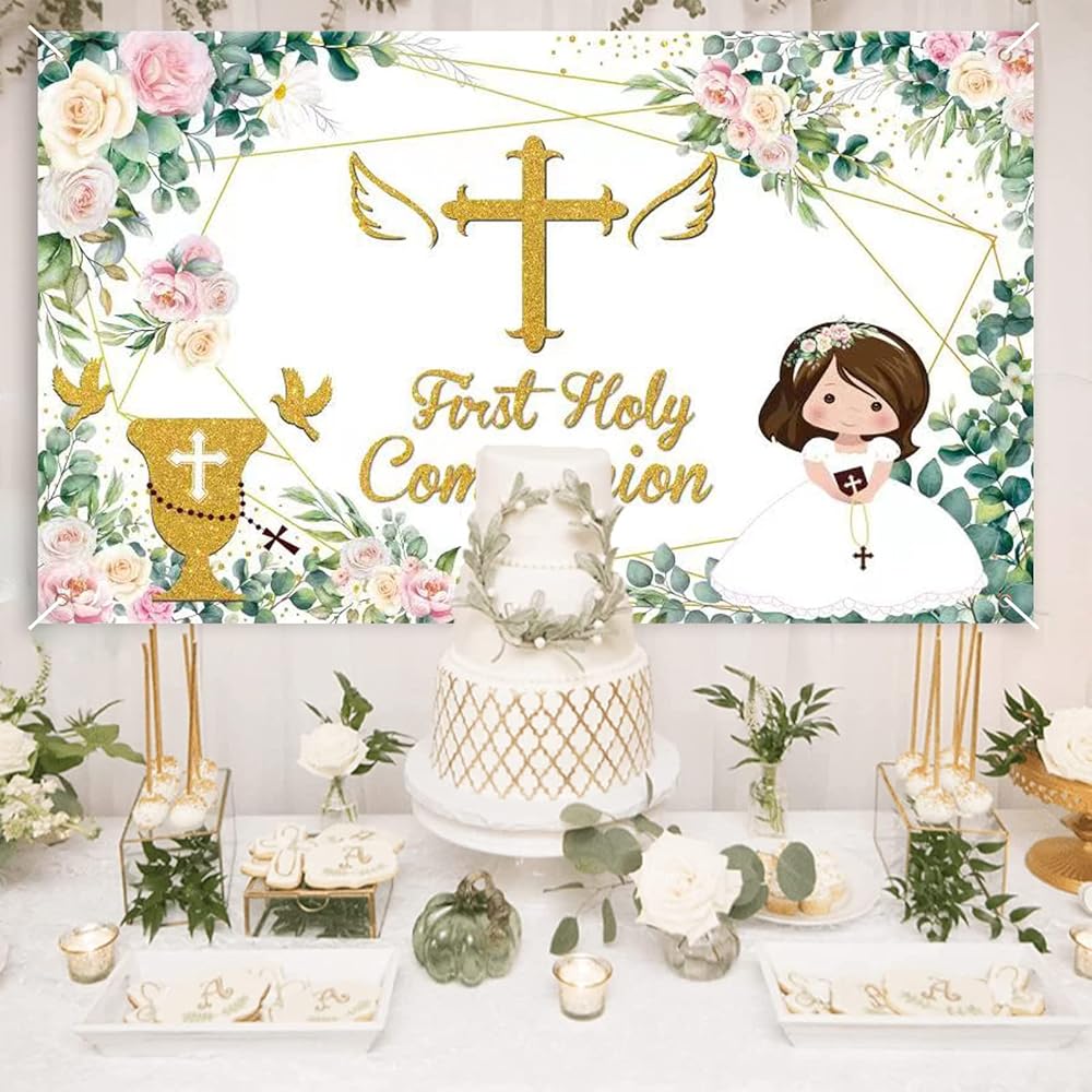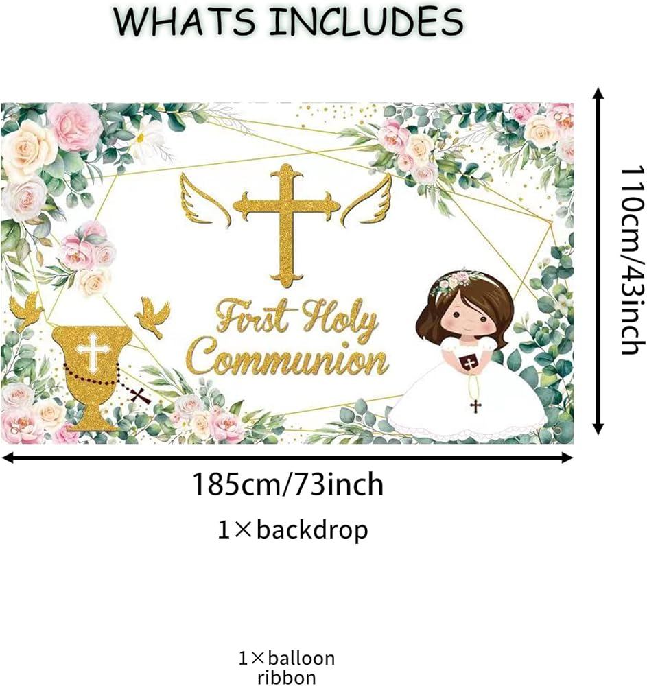 Baptism Party Decorations:1 pcs “First Holy Communion” baptism backdrop banner and a 13 feet white string for hanging.This green and gold god bless photography background banner is designed with gorgeous eucalyptus leaf garland and gold stamped “First Holy Communion” letters,which looks really elegant and fresh.
