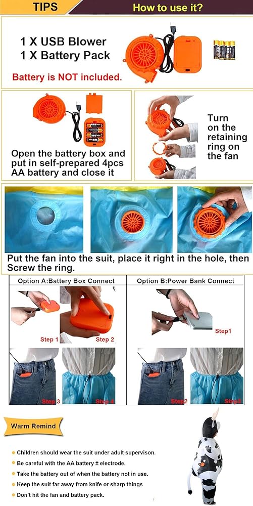 RED CLOWN BLOW UP SUIT PACKAGE INCLUDE:big butt clown inflatable costume adult suitable for most adults. big butt clown costume package include 1 x big butt clown inflatable costume,1 x usb mini fan blower,big butt clown blow up costume mini fan is requires 4 AA batteries and USB connected mobile power.(not including battery)