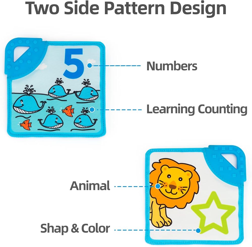 Early Development Toys: The advanced color teether book can arise toddlers after 6 months of color cognition and intelligence. Parents could spend interactive education time by teaching their kids to count the animals to match the number of flash card illustration printings.