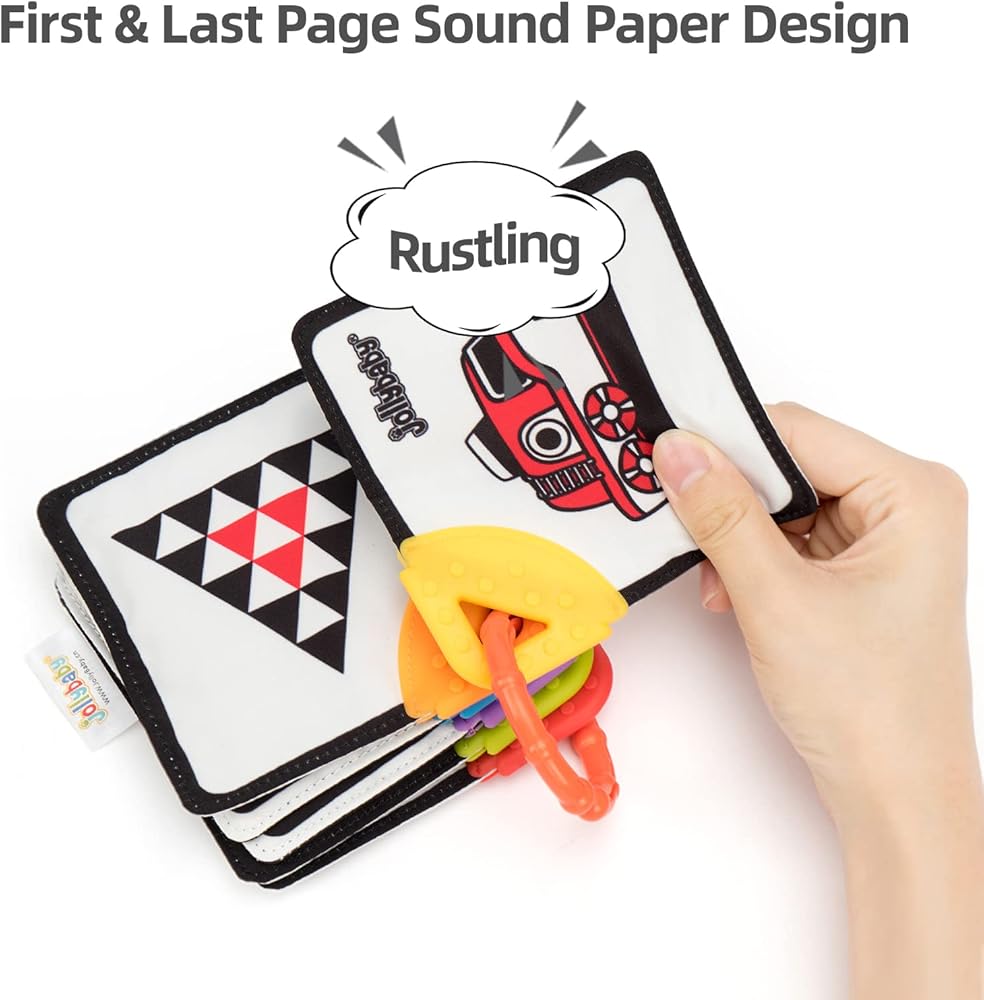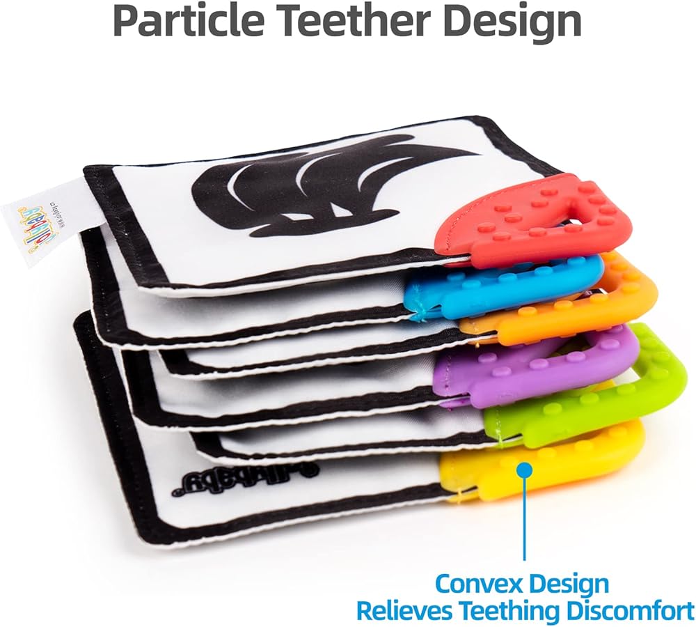 Sensory Teether Book: The teething toy book includes 6 pieces of high contrast flash cards. There are 3 color options for baby early education step by step. Black & White for 0-3 months newborn; Black White Red for 3-6 months; Colorful one for 6 to 12 months.