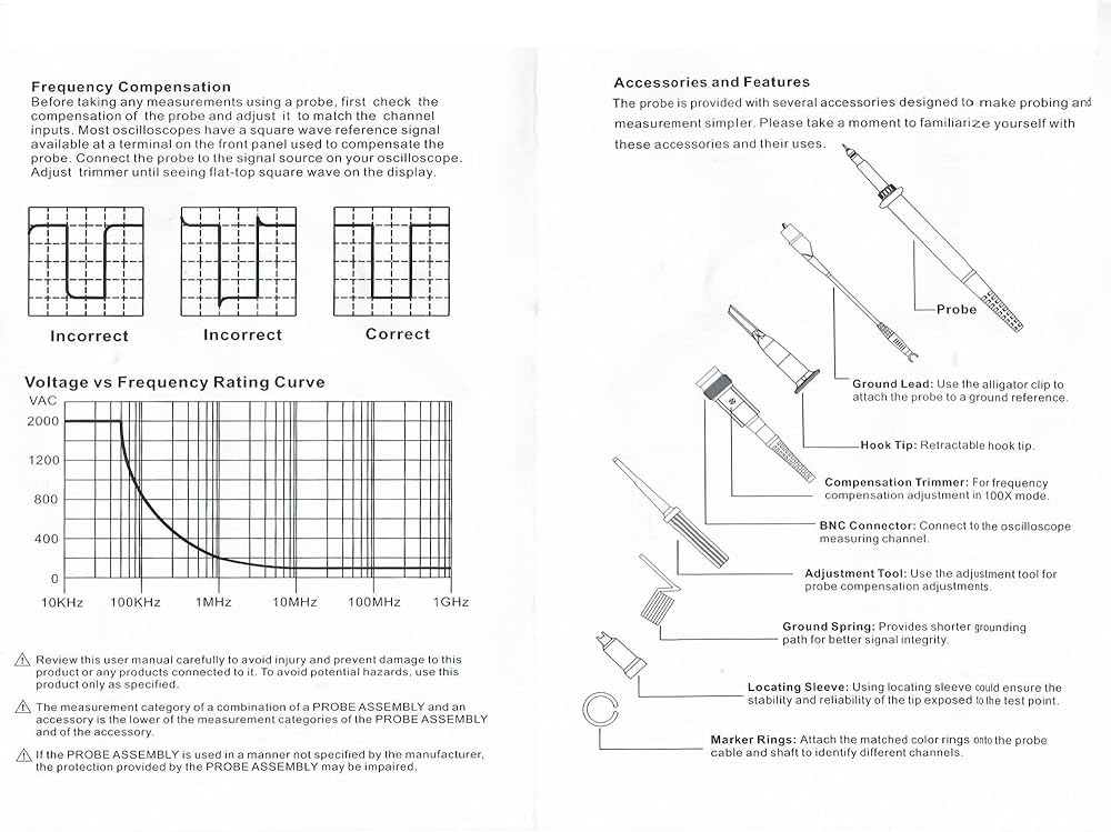 - Attenuation Ratio: 100:1; Bandwidth: 100MHz; Rise time: 3.5ns; Input Resistance: 100MΩ ±2%; Input Capacitance: 5pF; Max. Input Voltage: 2KV Working Voltage(Vp-p); Compensation Range: 10pF~35pF;