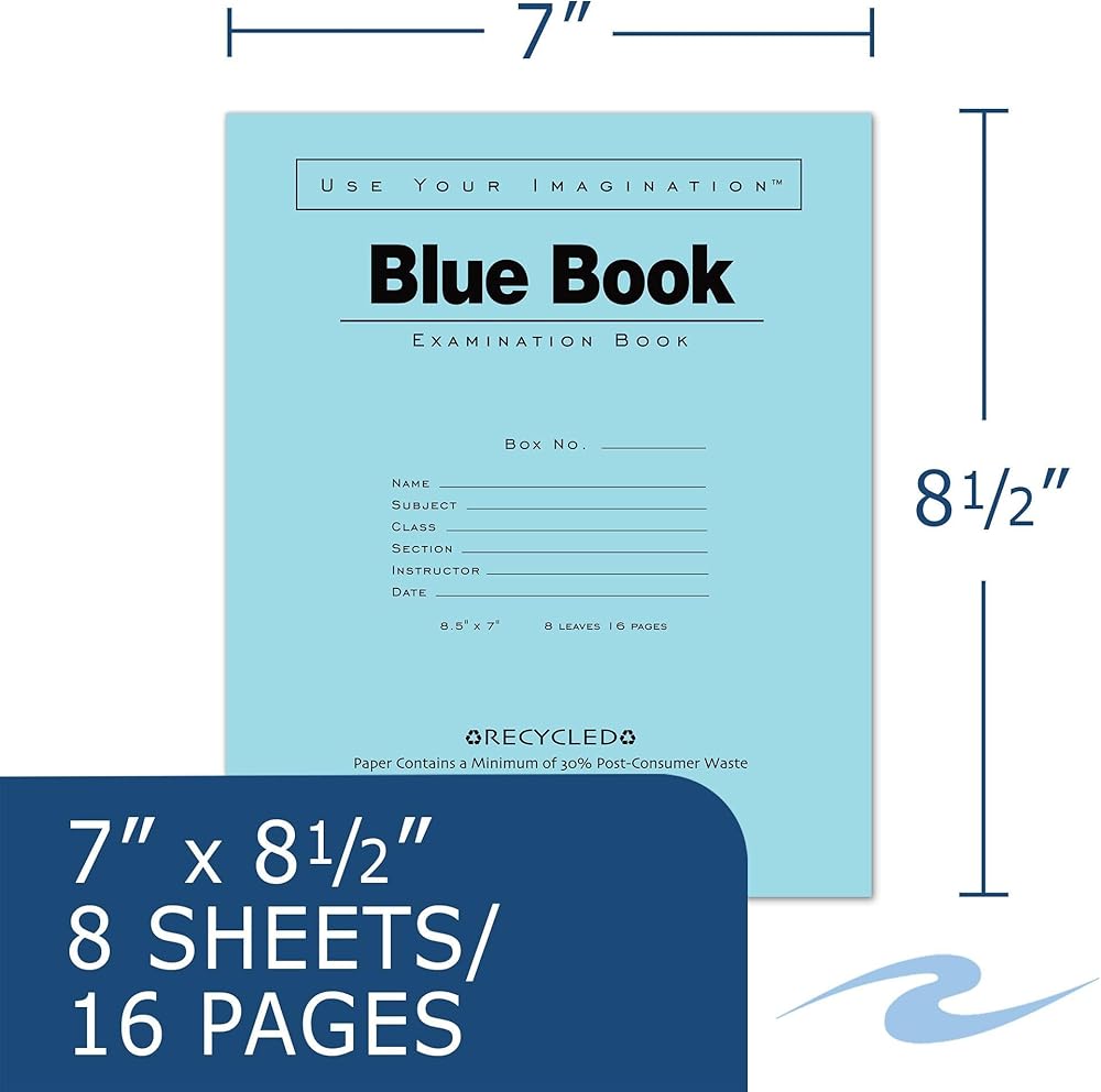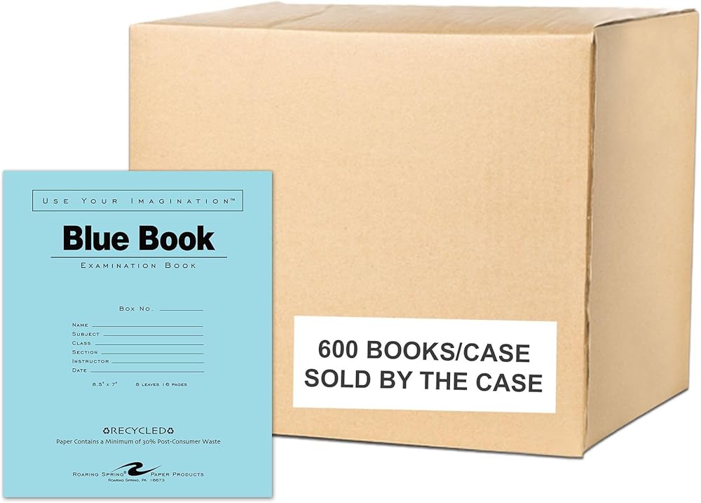 ROARING SPRING Recycled Exam Blue Books, 600 School Examination Booklets, 8.5" x 7", 8 Sheets/16 Pages, Wide-Ruled with Margin Student Testbook, Made in USA