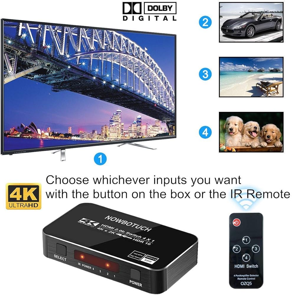 4 Inputs 1 Output 4K@60Hz HDMI Switches: NOWBOTUCH 4 ports HDMI switch supports HDR10, HDCP 2.2(Also backward compatible with HDCP 1.4, 1.3), supports HDMI 2.0(RGB 4:4:4), 36bit per channel deep color, HDMI splitter selector supports 4K@60Hz resolution, MHL function, with LED indication.