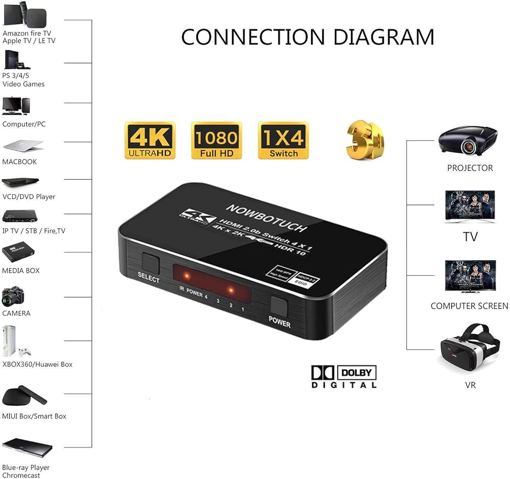 Wide Device Compatibility: NOWBOTUCH 4 port HDMI switch works with HDMI integrated devices such as Amazon Fire Stick, LE TV, PS3/ 4/ 5 Video Games, Macbook, VCD/ DVD Player, IP TV, STB, Media Box, Camera, Xbox360, Xbox one, Huawei Box, MIUI Box, Smart Box, Blue-ray Player , PC/Computer, YUV 60Hz, RGB 30Hz, ROKU 4, SAT Receiver, Digital camera, Projector Tivo, Vizio.