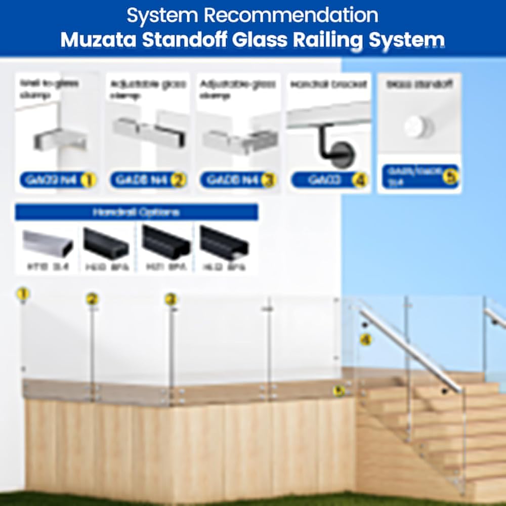 Glass railing products - Muzata provides several types of glass clamps to meet different needs. You can search Muzata GS10 for polish rectangle glass clamp, GA04 for square glass clamp, GA05 for OD 42mm glass standoff, GA06 for OD 48mm glass standoff