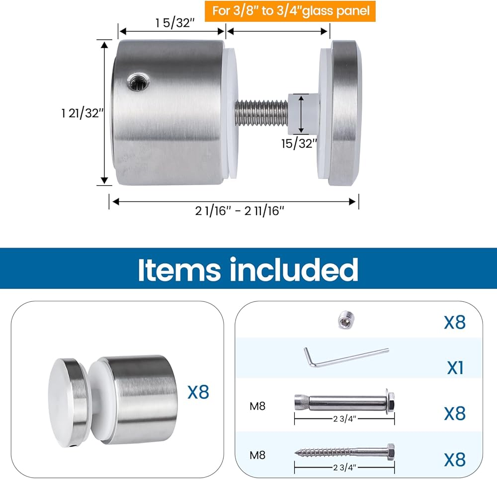 Large adjustment range - The glass standoff screw is designed to clamp glass with a simple look. Suitable for glass panel from 3/8'' to 3/4'' (10mm to 19mm)