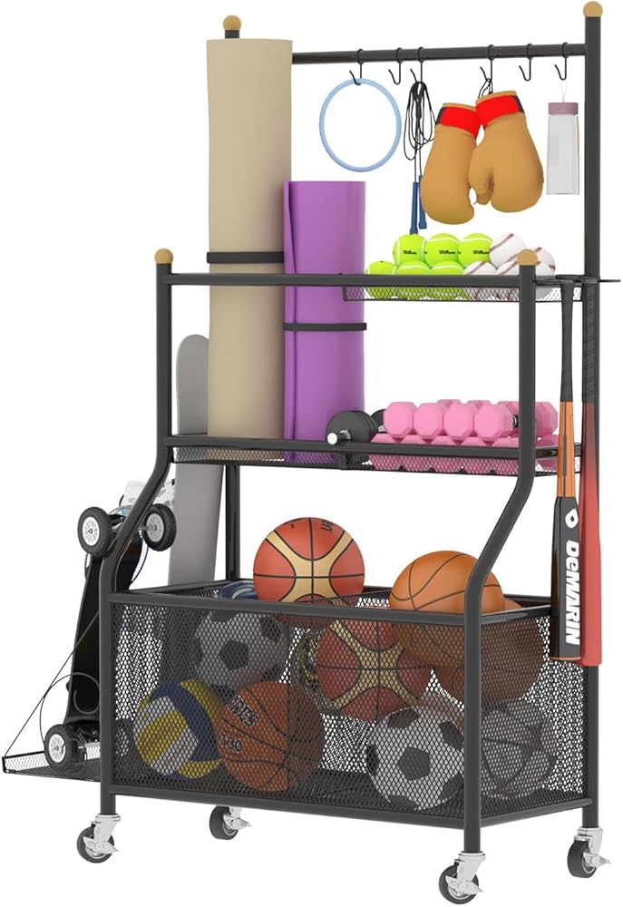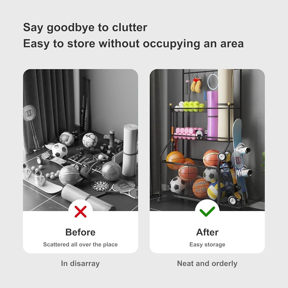 【Customizable Configuration】We equipped with removable compartments which make the customizable wire mesh bin provide flexibility to adapt to different equipment sizes and can be easily reconfigured as your sports collection evolves. We also designed 3 removable baskets for the middle layer to allow you to customize the organizer to suit your changing storage needs. The side skateboard rack can accommodate skateboards, backpacks, caps, and other items.