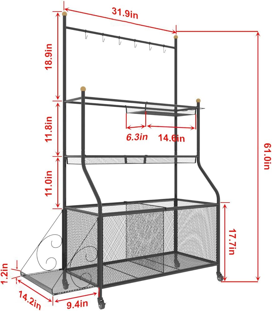 【Special Design Sports Storage System】:Our sports equipment organizer features 4 layers,in total which include customizable wire mesh bin,side bat rack, side skateboard rack,3 removable baskets,top layer with 6 movable hang hooks( for items such as helmets, backpacks, bags, gloves, ball caps, jerseys and all your other sportswear.)