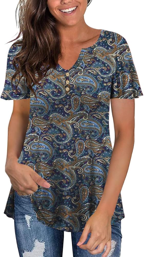 - This women tops features a henley neck with button-up closure and short sleeves, providing a sophisticated yet casual look