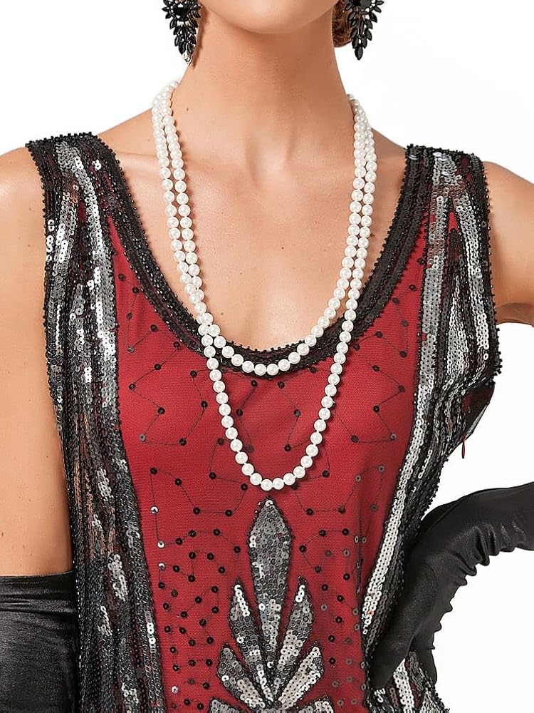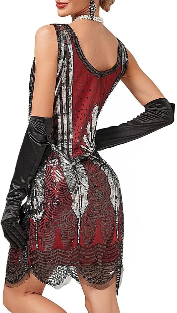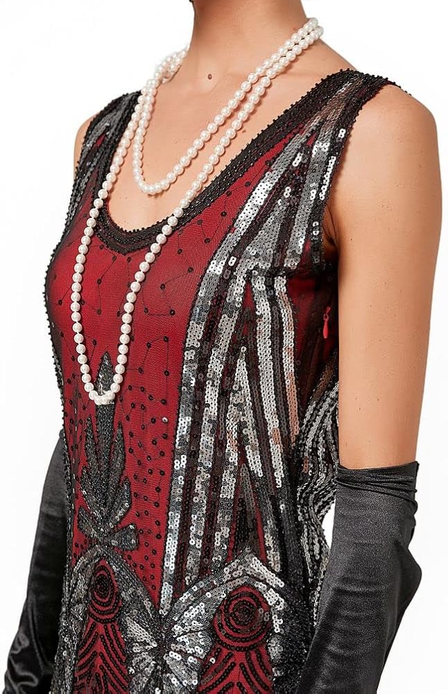 Women 1920s Gatsby Lace Short Sleeve Tassel Cocktail Flapper Dress with Tea Party Accessories Set