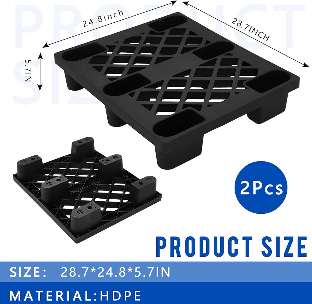 Heavy Duty Plastic Pallets for Basement 25 x 28.7 x 5.7 Inch Waterproof Storage Grid Pad Lightweight Floor Pallet HDPE Breathable Grids Racks for Garage Supermarket Basement, Black(2 Pcs)