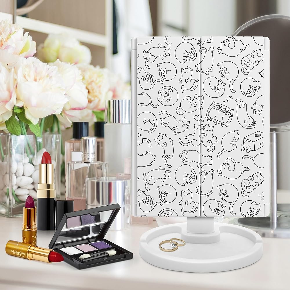 THOUGHTFUL CAT LOVER GIFTS - cat lover can adjust the angle of the illuminated makeup mirror as desired, and the tri-fold design allows for easy folding when not in use, protecting it from dust and scratches. The detachable base of this personal mirror is travel-cat loverly.
