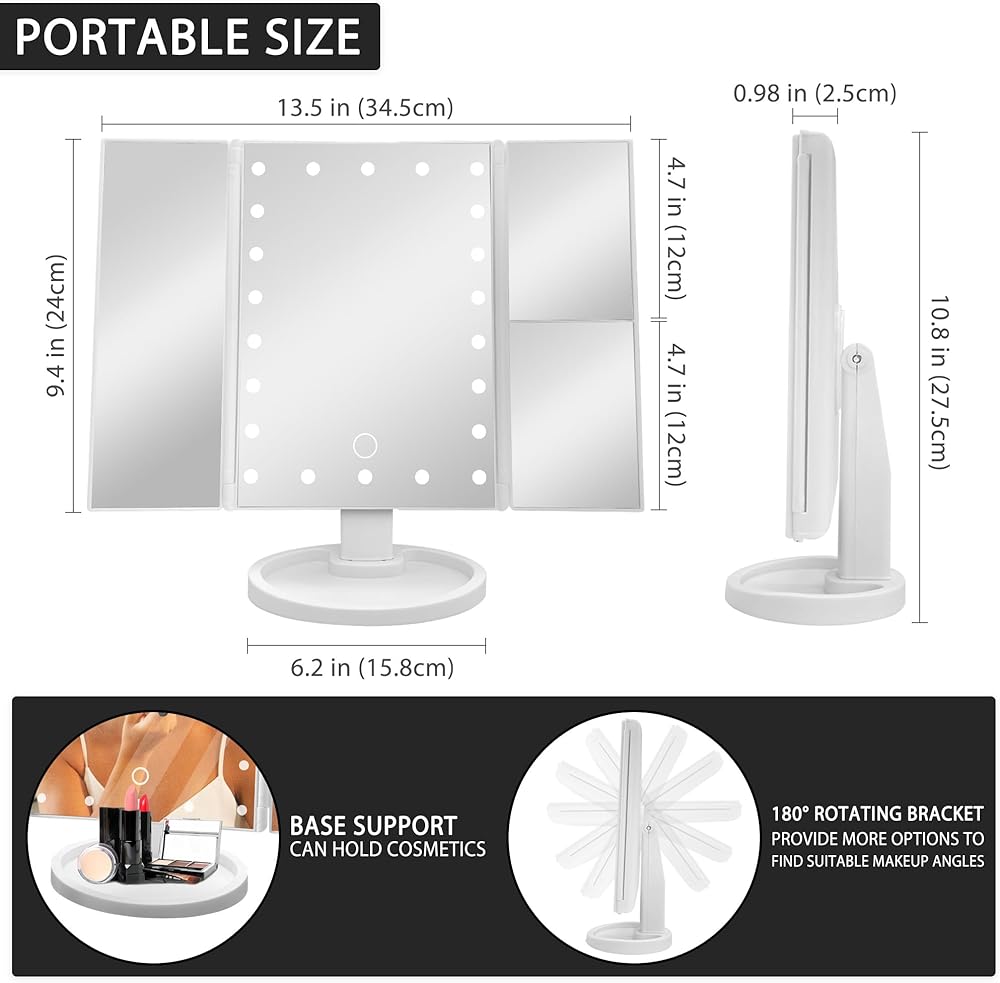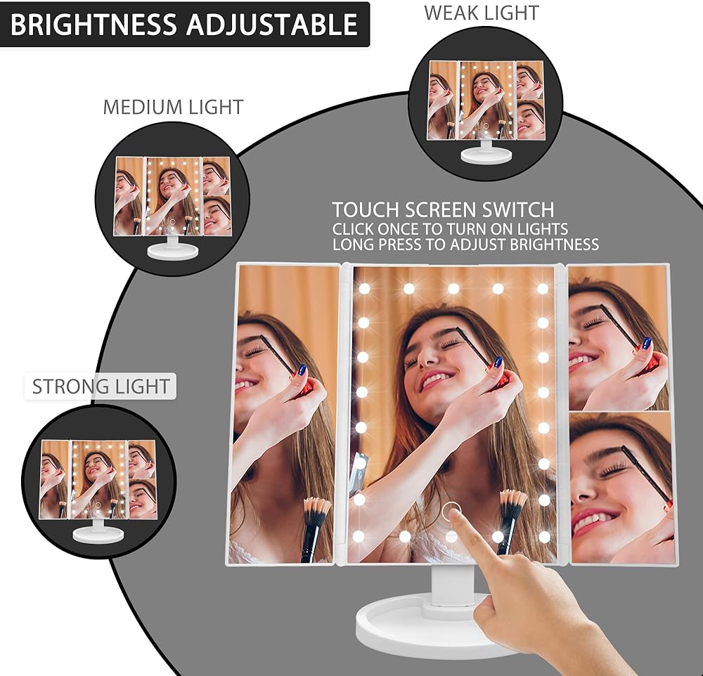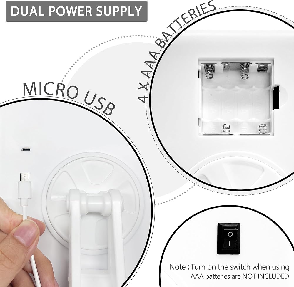 DUAL POWER SUPPLY - This vanity mirror can be powered by either 4 AAA batteries (not included) or a provided USB cable. Please note that the mirror itself cannot store electricity. The brightness can be adjusted conveniently using the touch-sensitive switch.