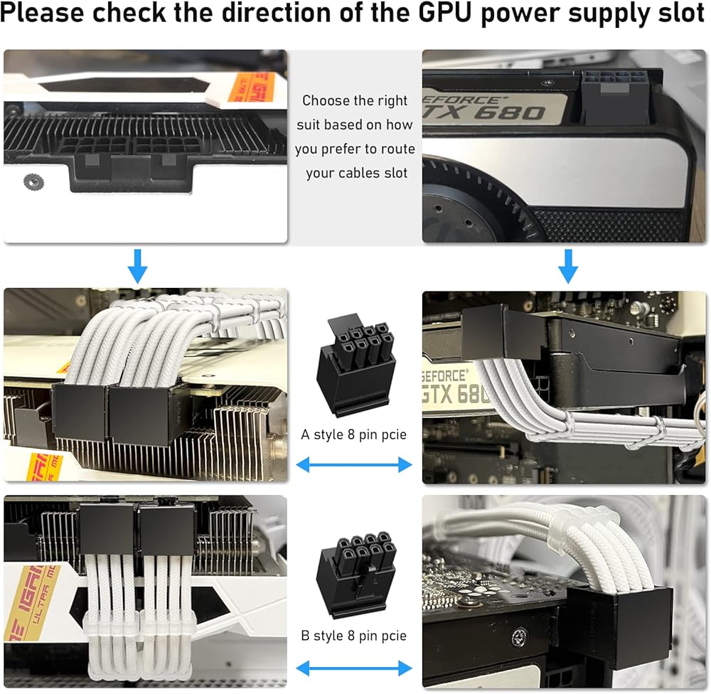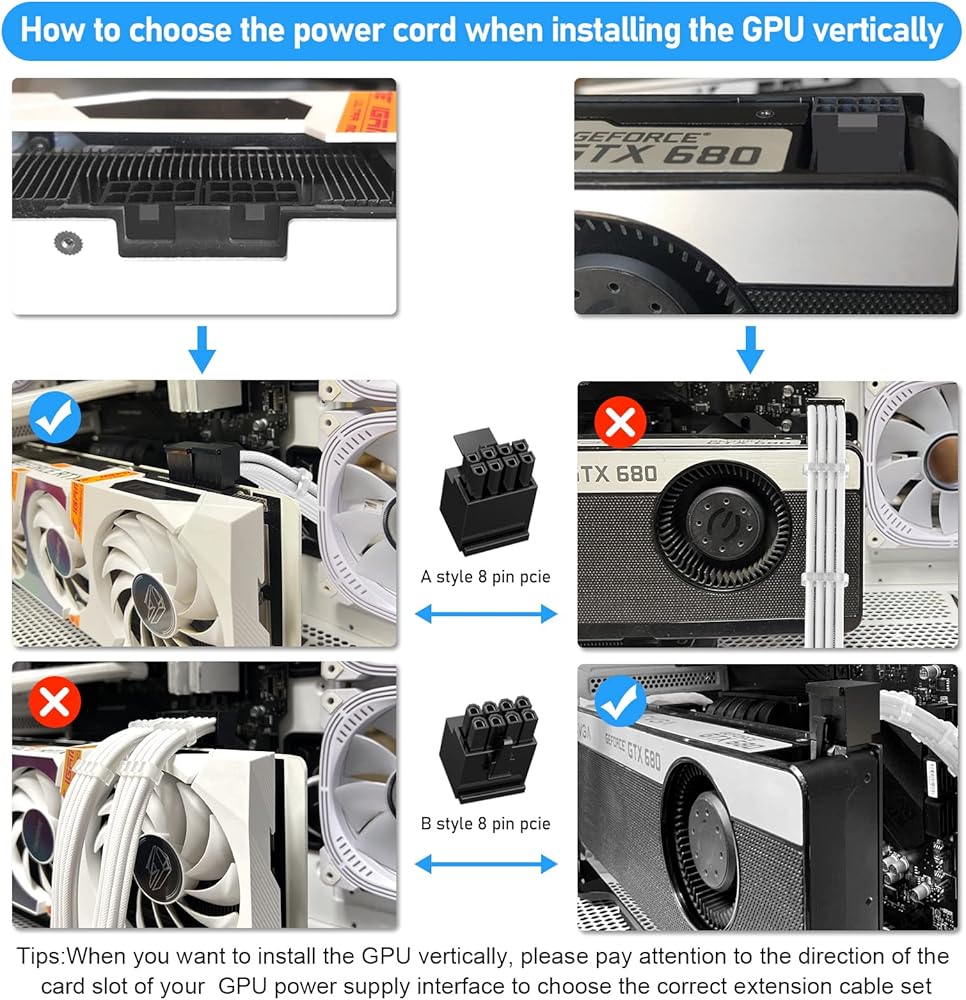 【Vertical installation of GPU】When you use our pc cables to connect a vertically installed GPU, please note,that when the card slot of your GPU power supply port is on the back panel of the GPU, please choose A style PSU cable extension set, When the card slot of your GPU power supply port faces the GPU fan, please choose the b style pc cable extension set. this is the only connection method, please refer to the product photo #6 for the detailed comparison chart