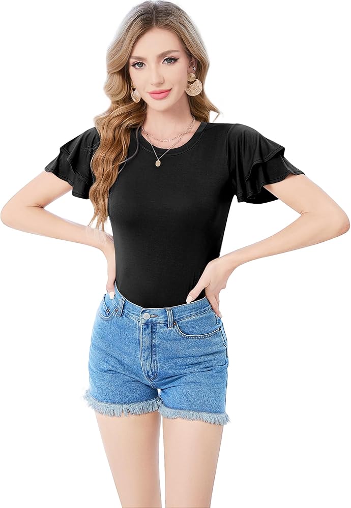 Features: Crew neck, double-layer ruffle sleeves, short sleeves, snap closure on the crotch with two buttons, slim fit.