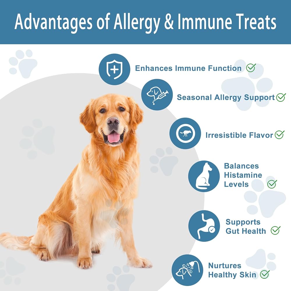Advanced Allergy & Itch Relief for Dogs: Our specially crafted Dog Allergy Chews provide comprehensive support against environmental pollutants, food, and seasonal allergies, effectively minimizing symptoms such as paw licking and itching.
