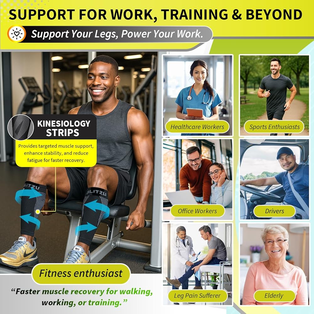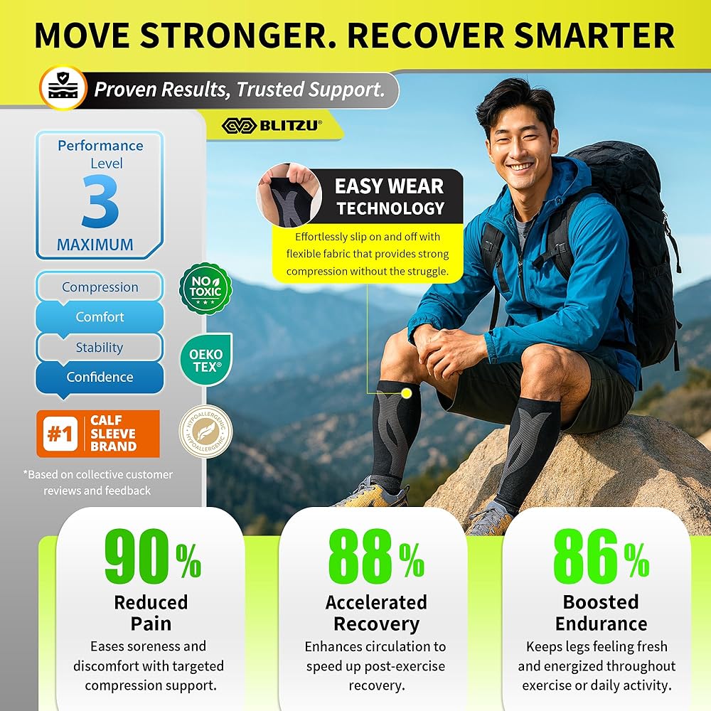 • SPEEDY RECOVERY: Leave the ice and pain medications at the door. Fight pain, recover and get back in the game naturally with BLITZU calf sleeves. Our leg compression sleeves relieve your leg fatigue by activating the natural pain-relief mechanism of your body and provide targeted support for key ligaments, tendons and muscles in and around your calf and shin area.