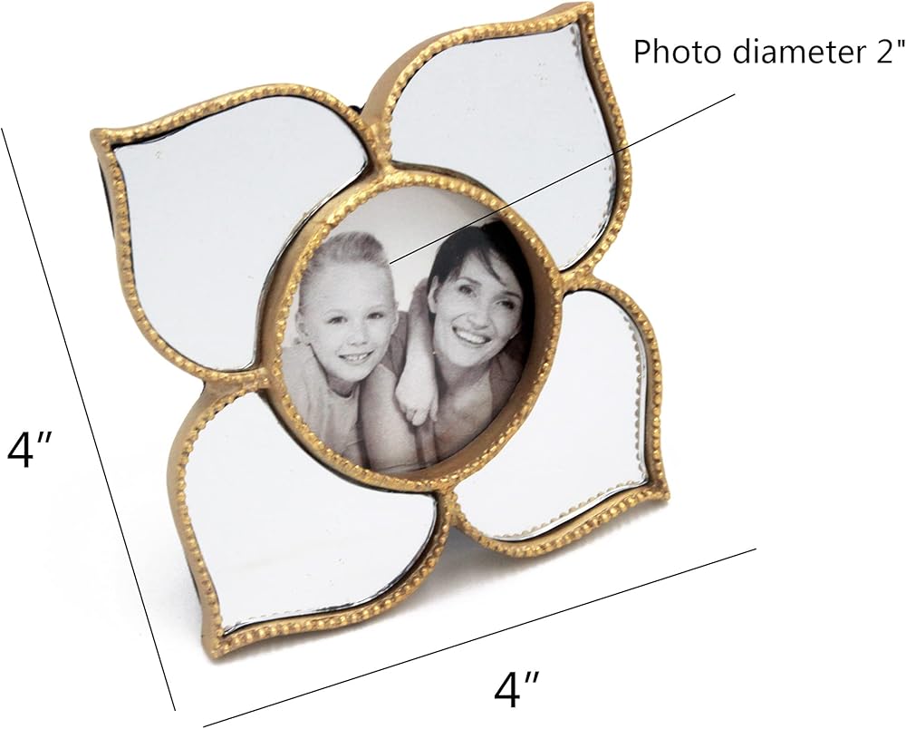 2x2 Round Photo Picture Frame with Petal Shaped Mirrors Gold Flower Shaped for Tabletop Desktop Display (Frame 4X4)