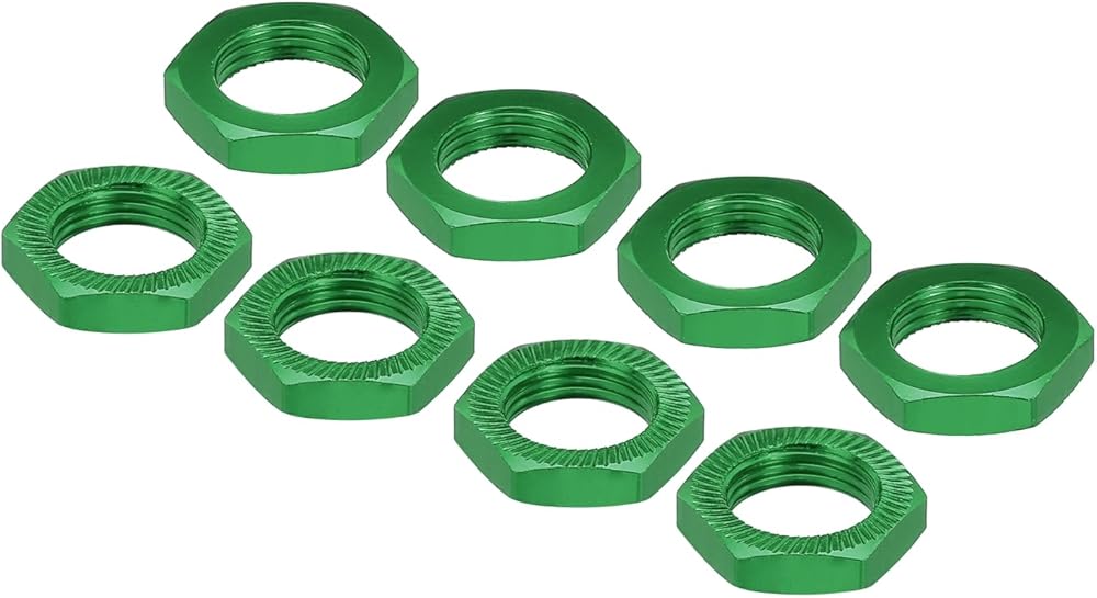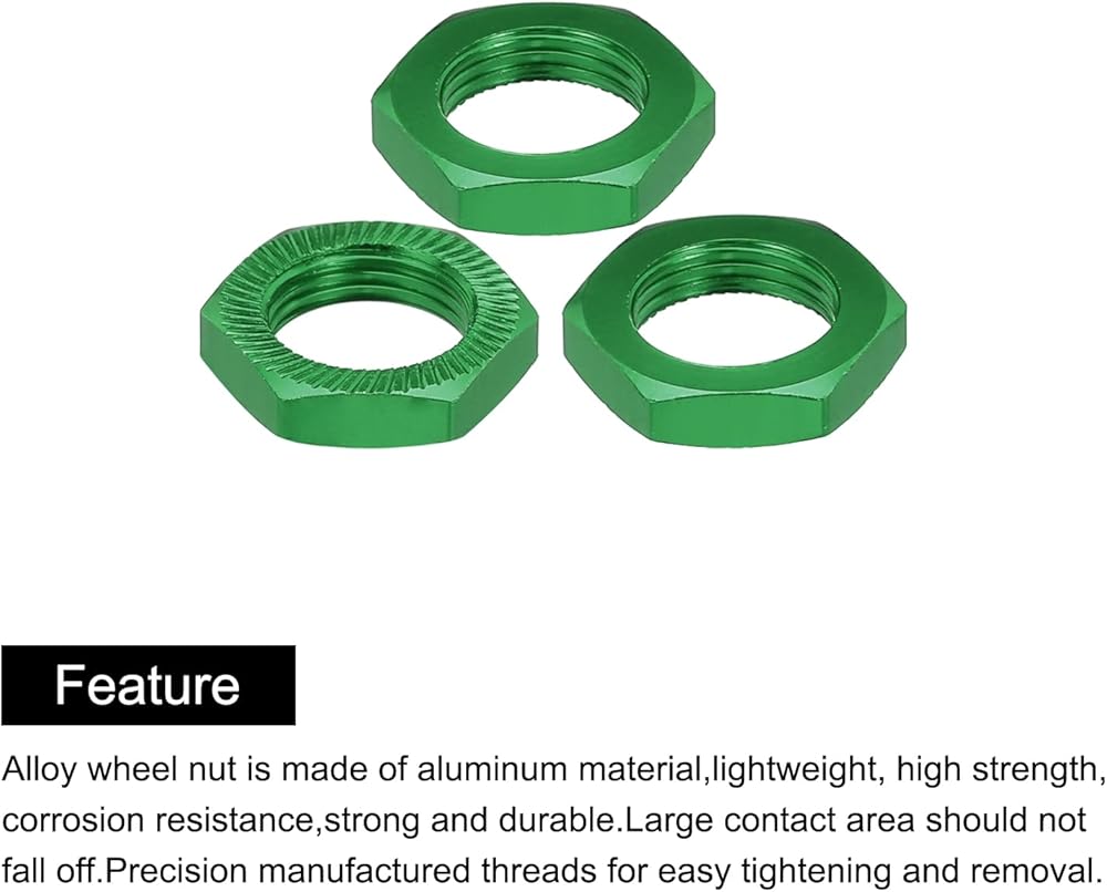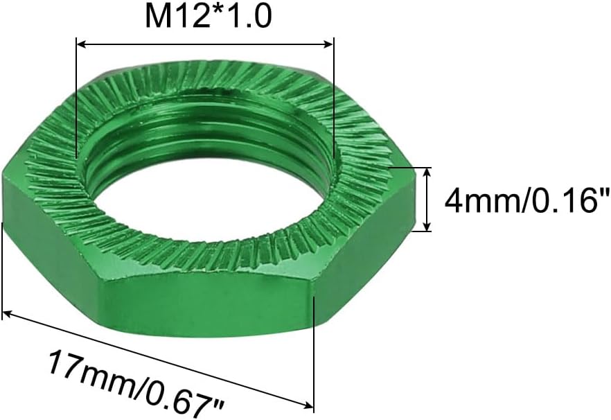 Aluminum RC Wheel Nuts ,is in size of:Length of opposite side:1cm/0.39 inch;Nut outside diameter:17mm/0.67 inch;Thickness:4mm/0.8 inch;Color: Black;Material: Aluminum;In the package of: 8 x RC Hex Wheel Nuts 17mm Thread 1.0mm.