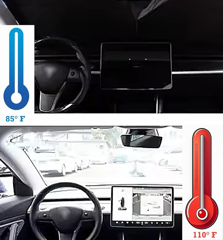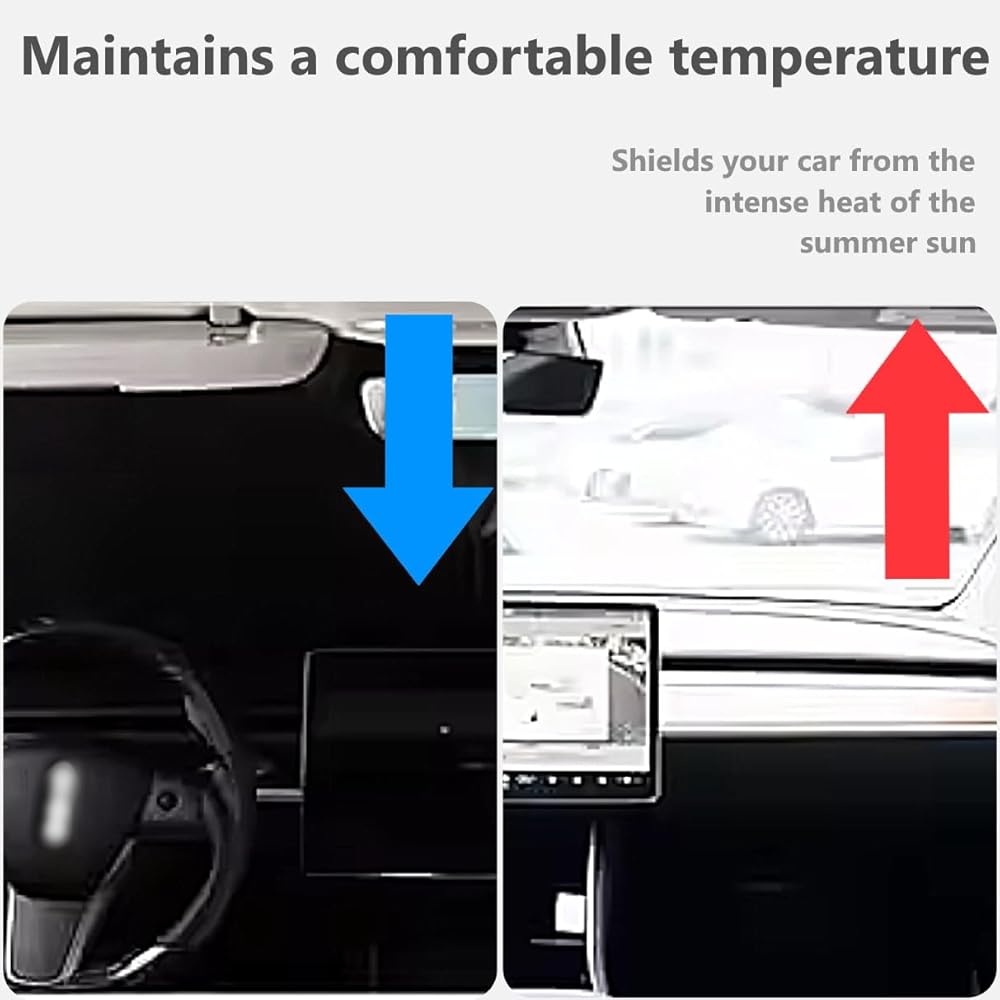 Enhanced Vehicle Interior Protection: Prevent the sun's harsh rays from raising your Tesla's interior temperature. Our sunshade safeguards against fading and cracking of your dashboard, steering wheel, and seats, maintaining the pristine condition of your vehicle's interior.