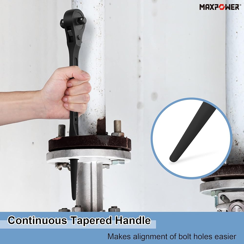 1/2" x 3/8" Dual head ratchets take up less space, Reversible drive ratchet with a continuous tapered handle for aligning bolts (Overall length 12 in.)