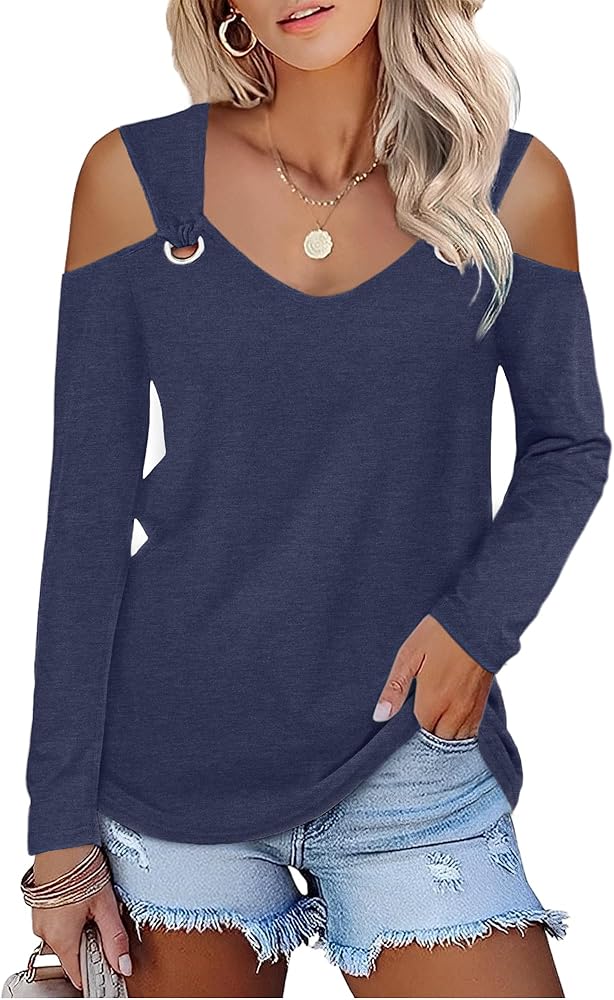 Womens Fashion Cold Shoulder Tops V Neck Navy Blue Blouse Tunic Shirts Summer Long Sleeve T Shirts