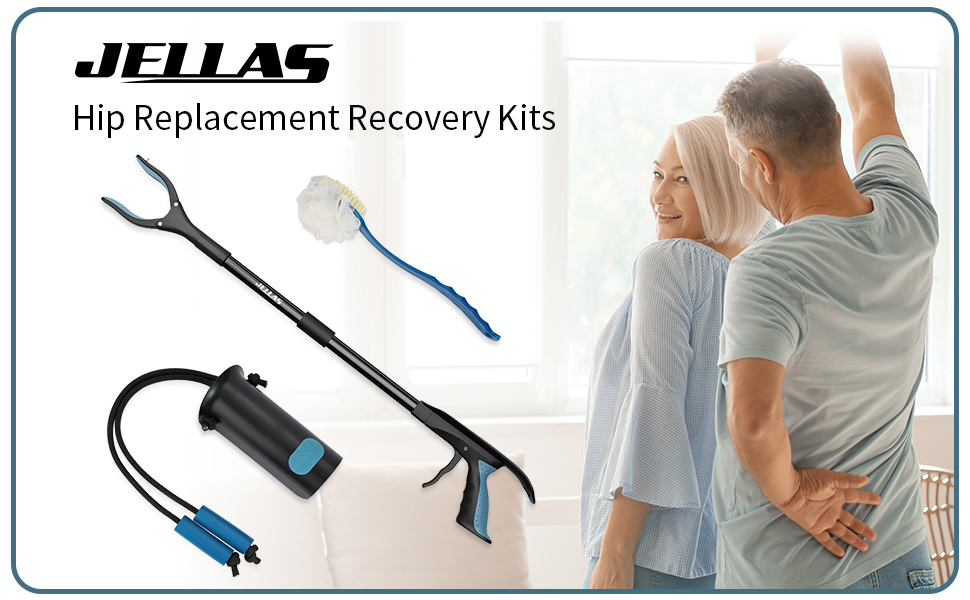 【Daily Activity Supports】Jellas economy hip replacement kit (3 pieces) collects assistive devices for patients or seniors to complete reaching or dressing routines during rehabilitation process; includes: 32" Reacher Gripper with shoehorn, Sock putter onner, and bath sponge with handle.
