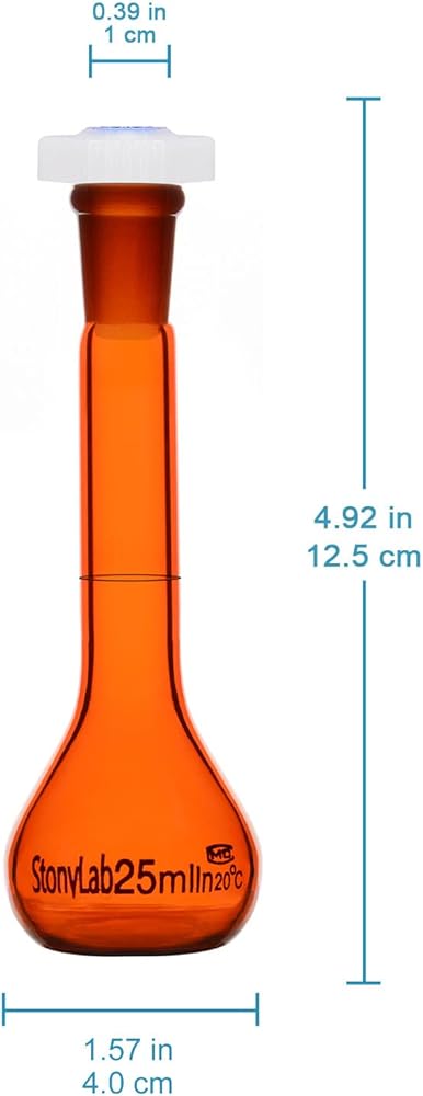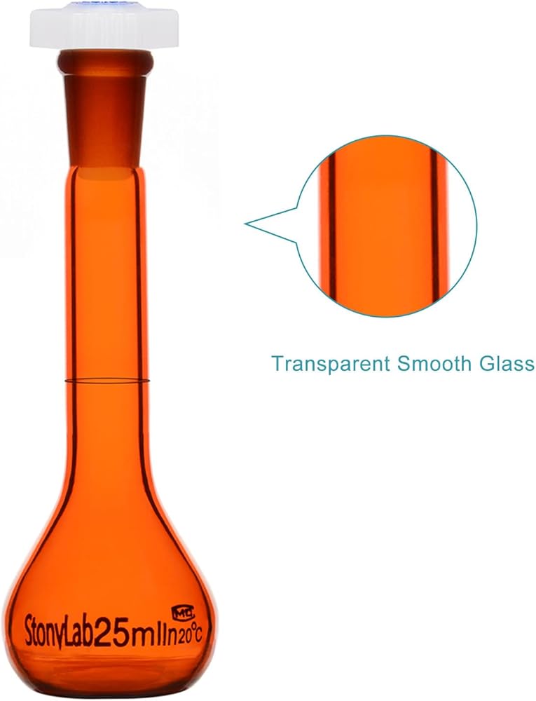 Low actinic amber flask ideal for solutions sensitive to light; note: volumetric flask cannot be heated or store solutions for long periods