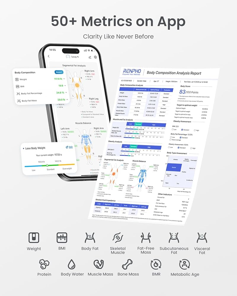 13 body composition analysis. The digital scale for body weight and fat use the latest bioelectrical impedance analysis (BIA) to accurately measure your 13 health metrics including weight, BMI, body fat, body water, protein, fat-free body weight, and so on. These body composition metrics are recorded in the app where you can check your improvements with a real-time graph.