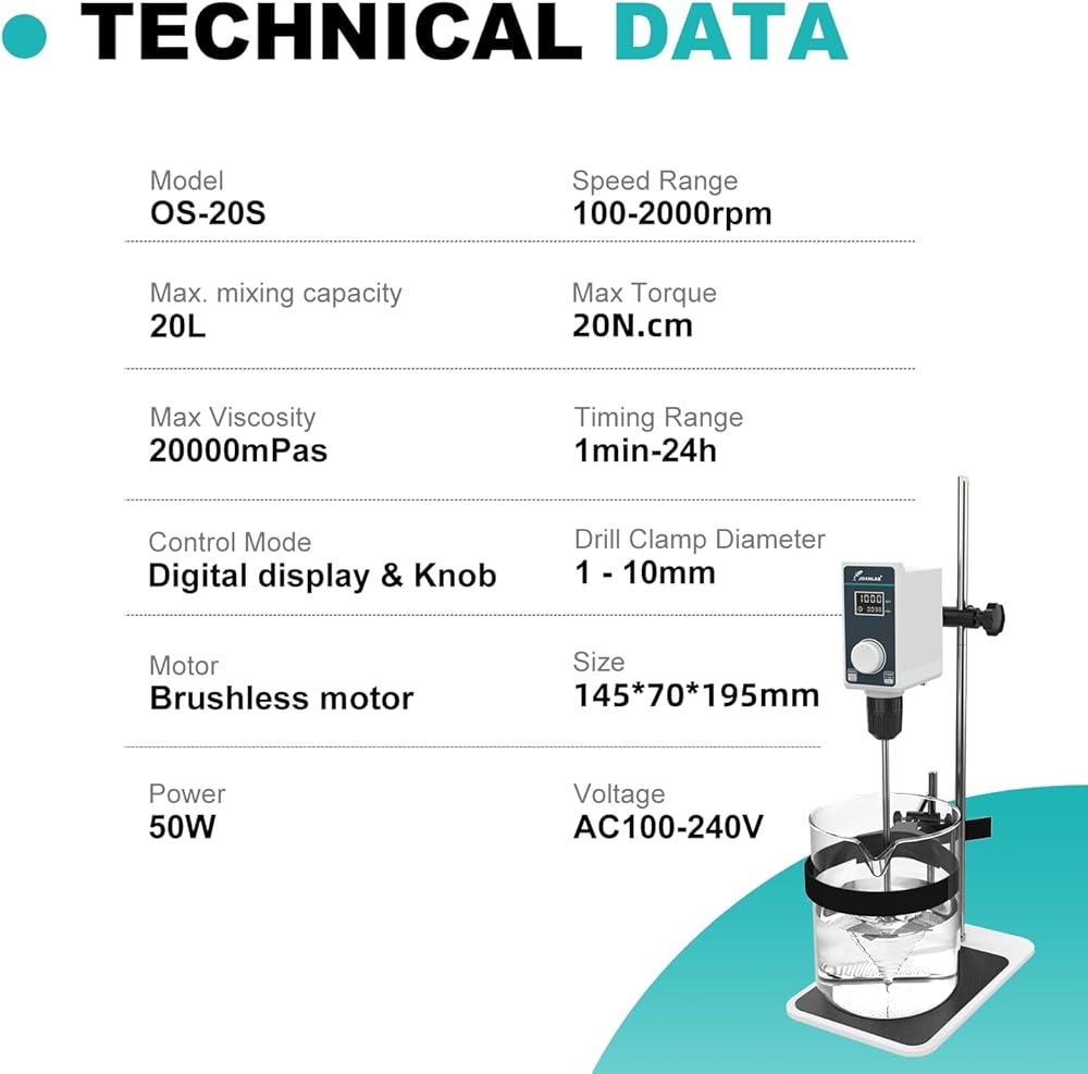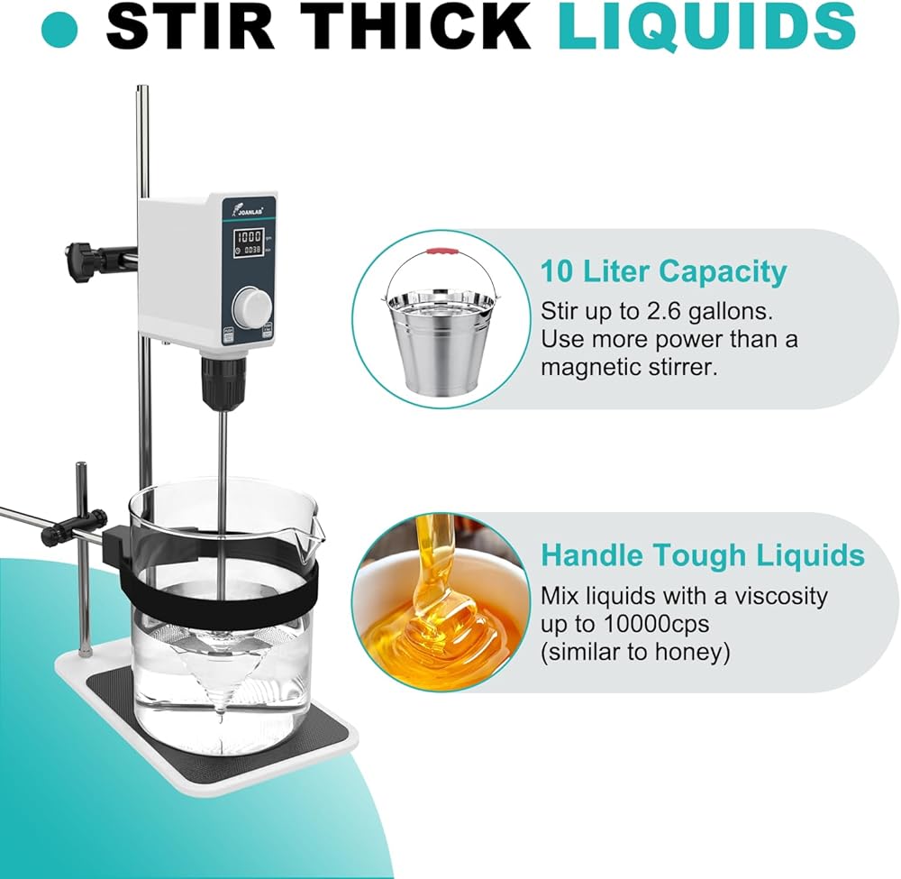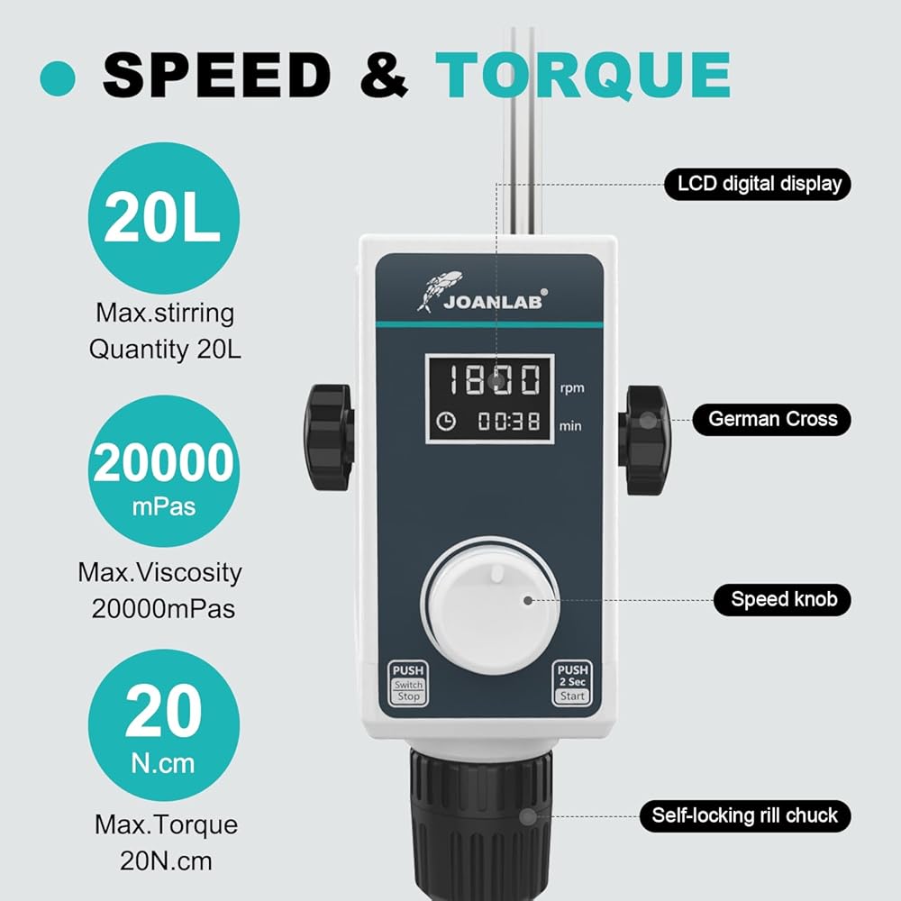 JOANLAB Overhead Stirrer Set 20L 20000 mPas Digital Overhead Mixer Lab Stirrer w/Stirring Rods 100-1500RPM Timing 1min-24h (Stand Included)
