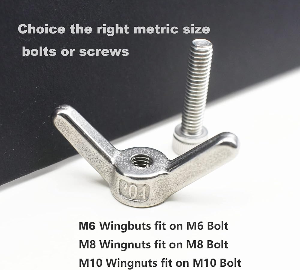 Easy to install: Serve as a nut, Use metric screws or apprapriate sized bolts to mount ss wing nuts. Just spin on on easily, tighten nicely, and stay in place. Please choice the right metric thread size match bolts or screws and driver.