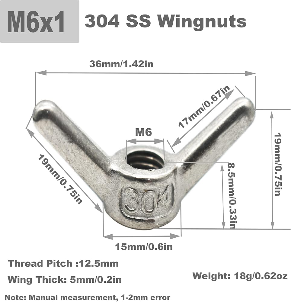 Measurement (Appr.): M8x1.25 304 Stainless Metric standard wingnuts. M8 stands for Metric thread inner diameter(8mm/0.31"), thread pitch 1.25mm.Thread Max outer diameter 0.61"/15.6mm,thick 0.35"/9mm.the wing thick 0.2"/5mm, wing length 0.75"/19mm : Fit on to M8x1.25 screws/bolts. Fully threaded, Right hand direction. More detail size please refer to the photoes.